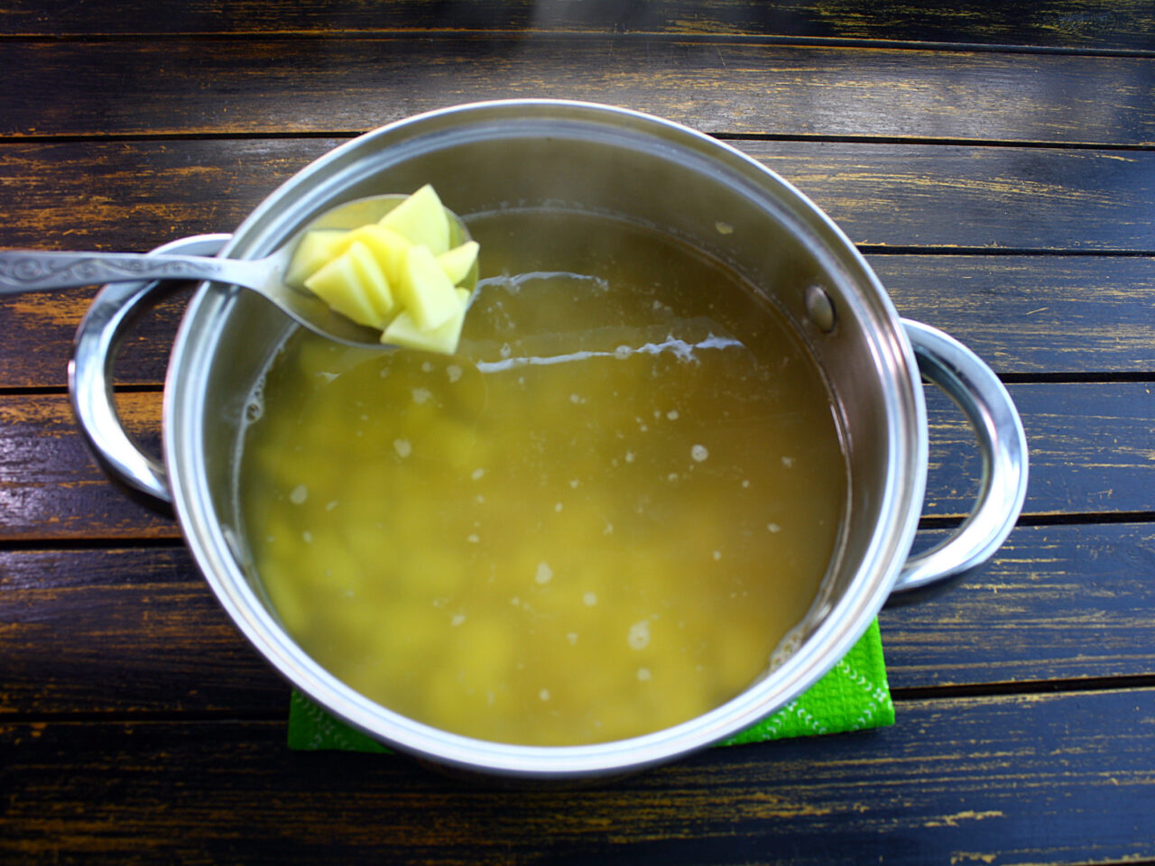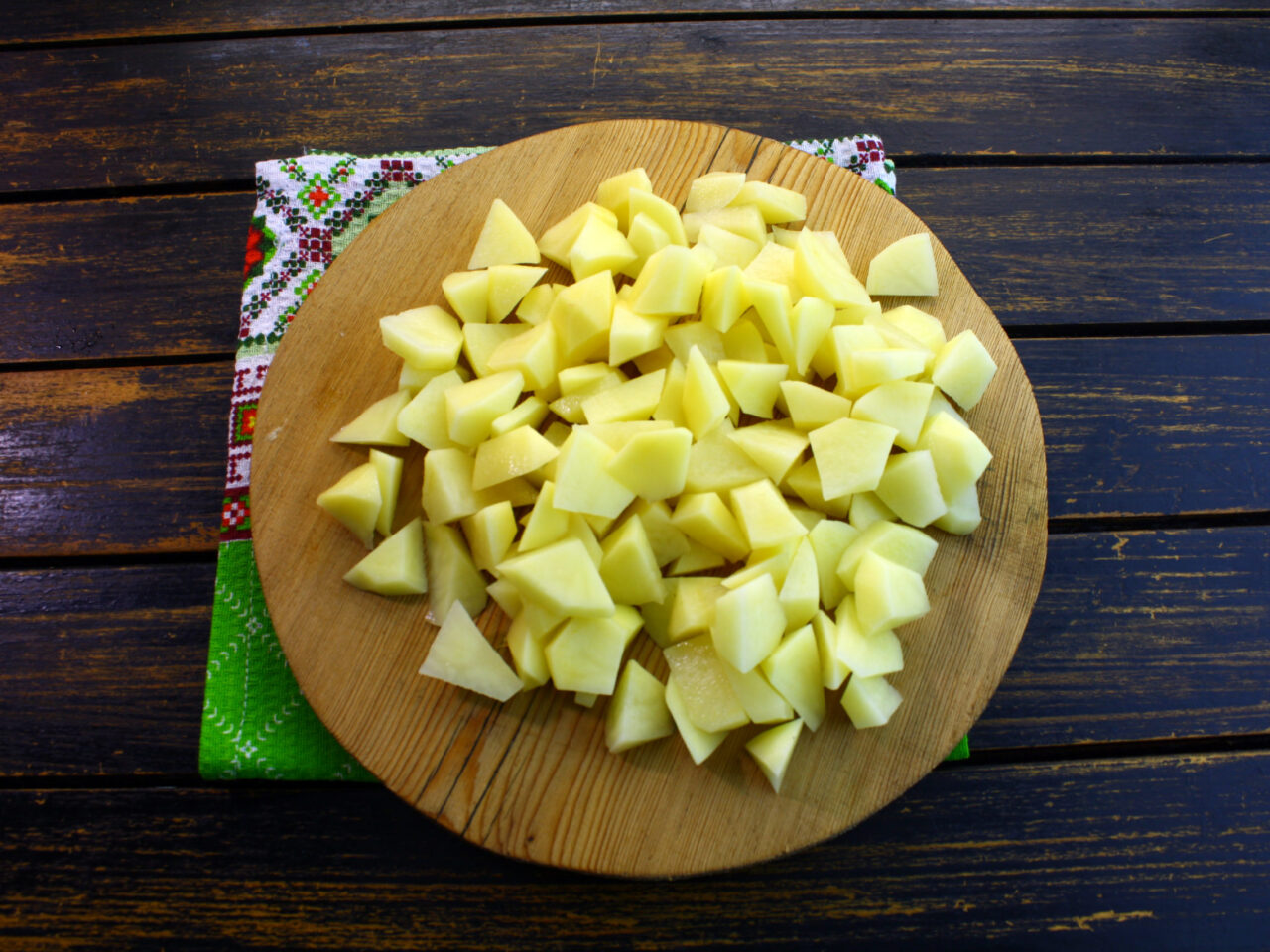 - Cartofii (curățați) sunt tăiați în bucăți mici.