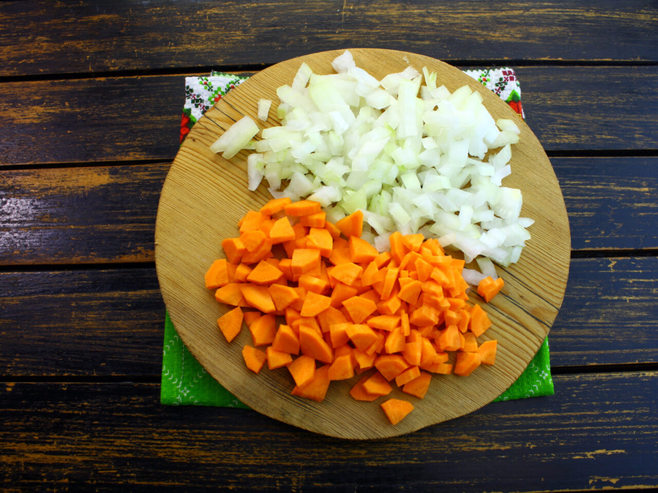 - Morcovii curățați sunt tăiați în felii mici, iar ceapa (curățată) în cuburi.