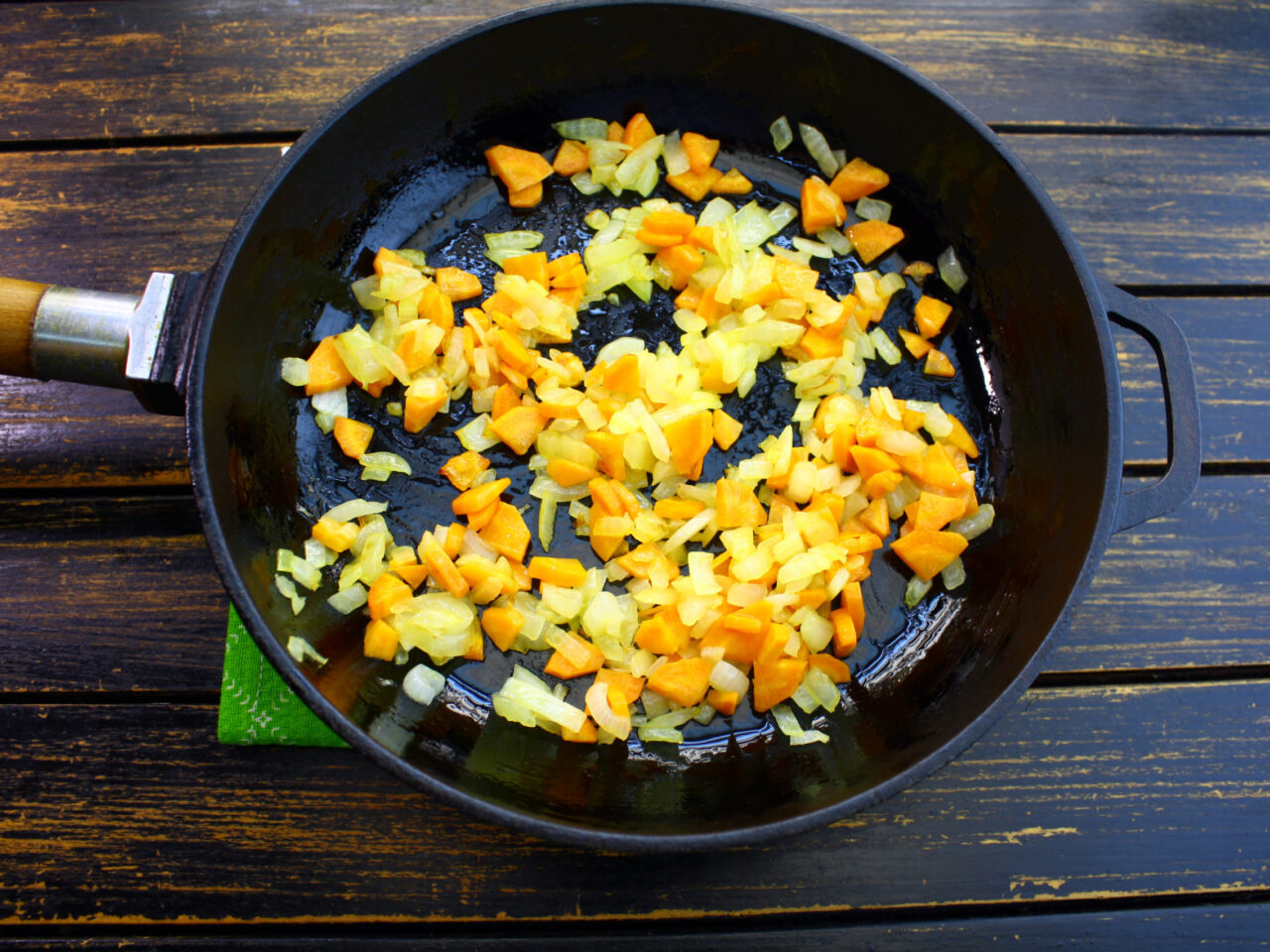 - Încinge uleiul într-o tigaie și prăjește ceapa și morcovii până devin aurii.