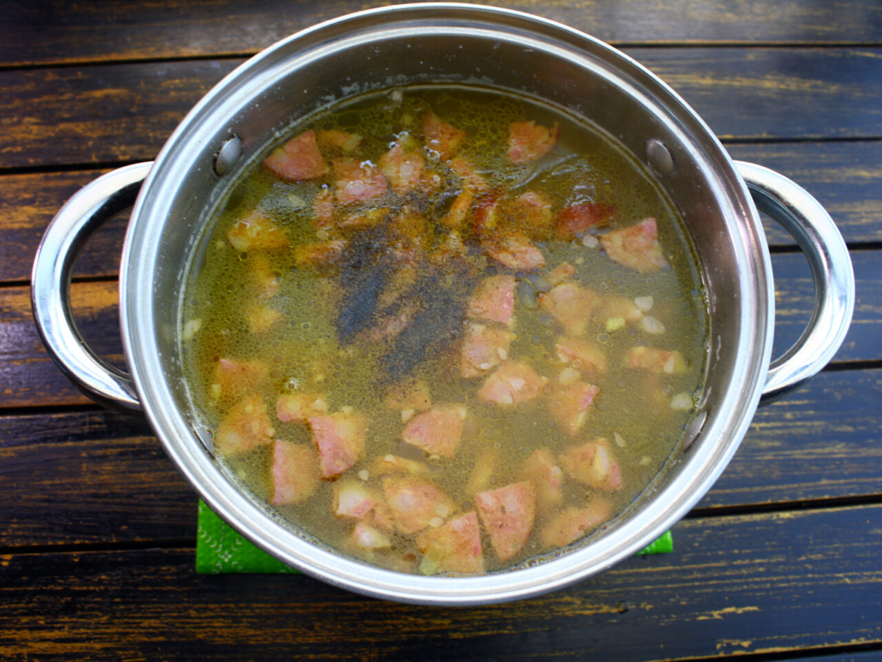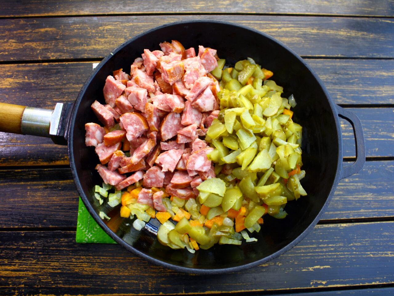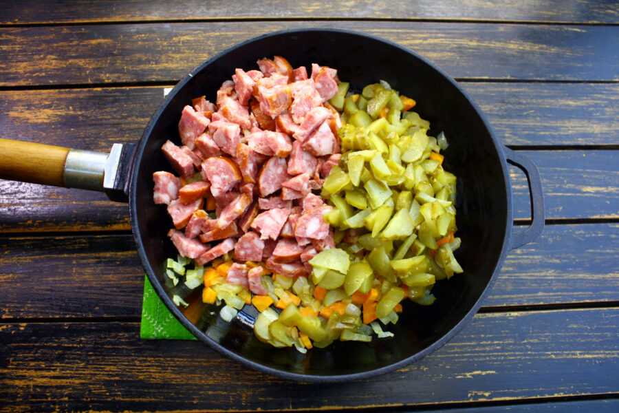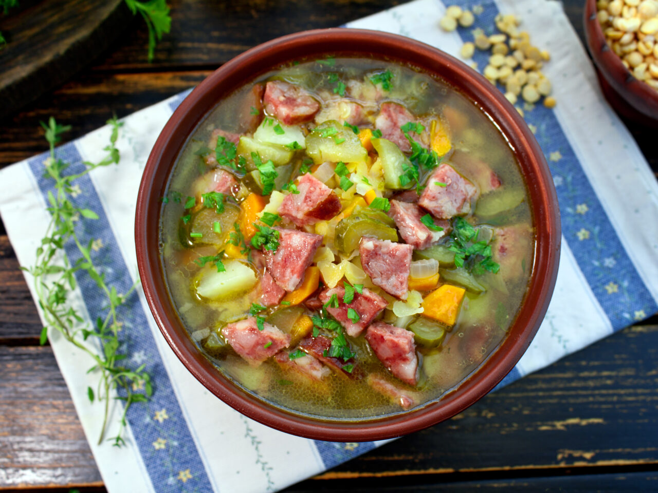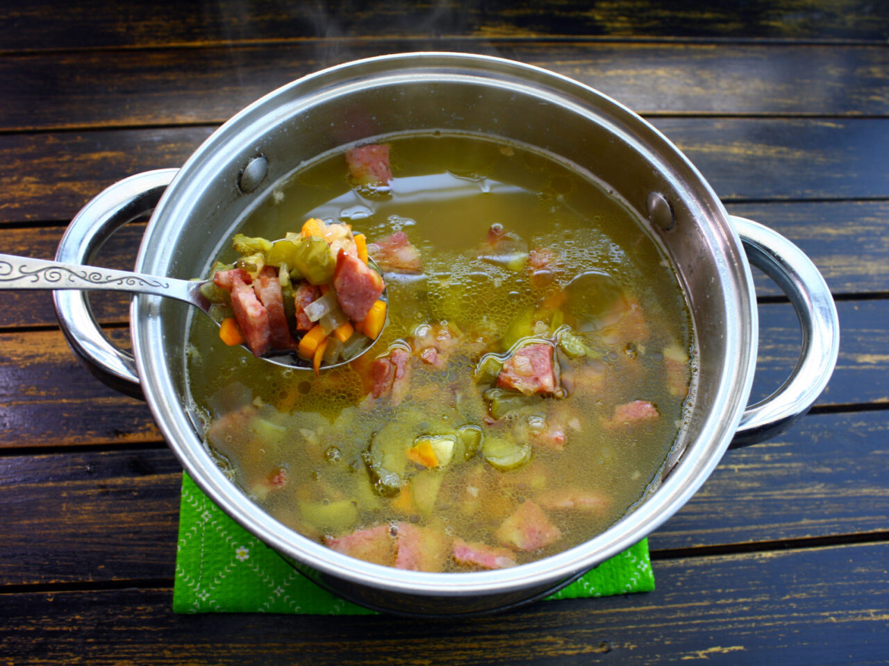 Prajirea apetisanta confera supei un gust bogat si o aromă plăcută de afumat. Castraveții murați se potrivesc bine cu celelalte ingrediente și adaugă o ușoară acrișoare preparatului. Nu veți avea nevoie de mult timp pentru a pregăti supa, deoarece nu este nevoie să fierbeți carnea, iar cârnații afumati adaugă valoare nutritivă supei.