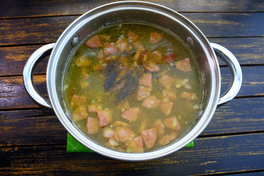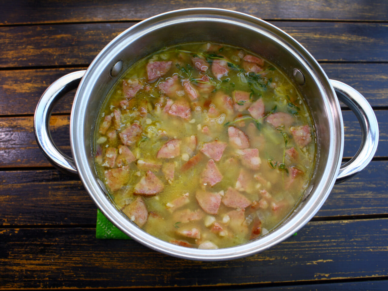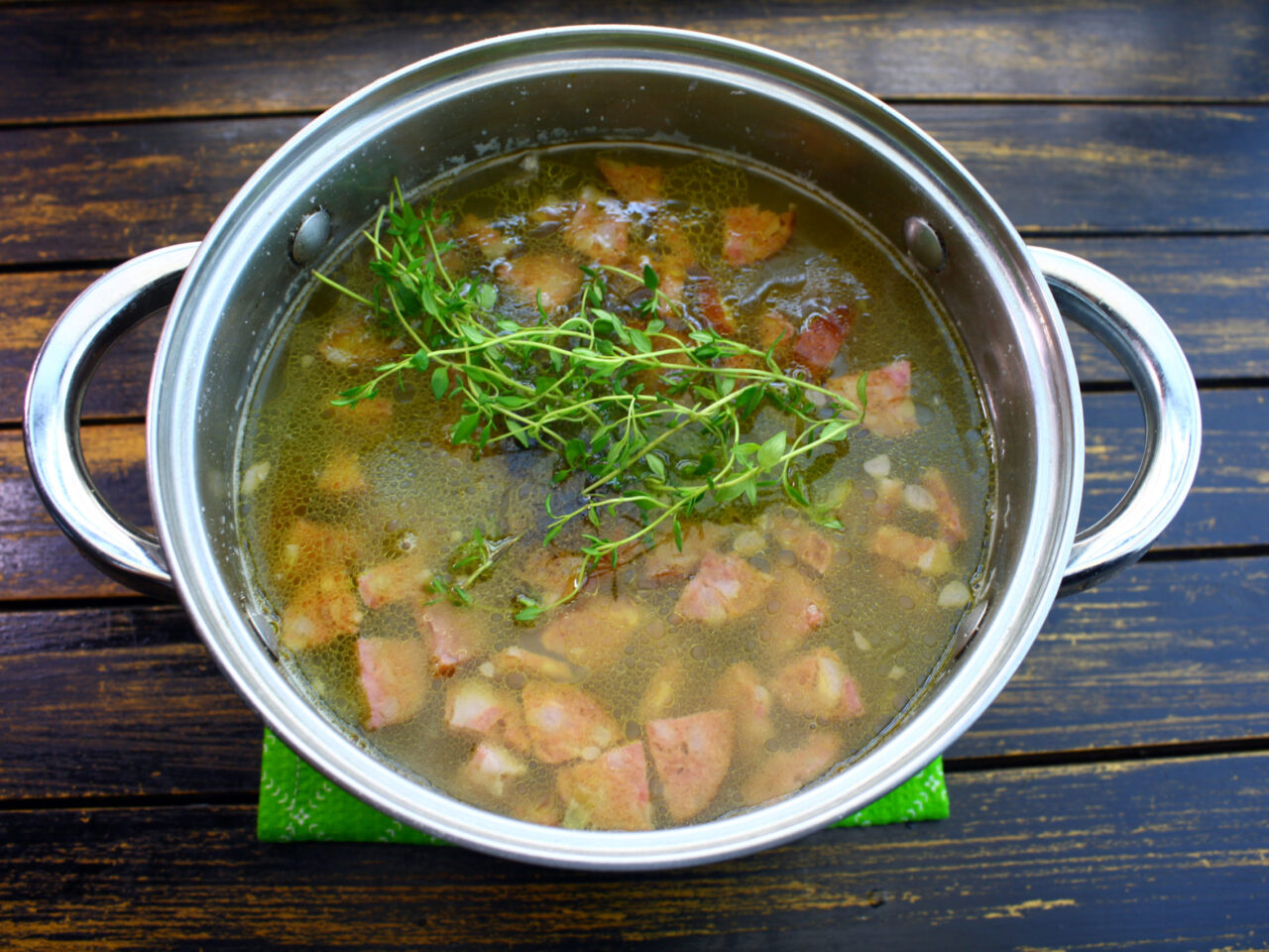 Supa de mazare delicioasa si satisfacatoare cu carnati afumati, castraveti murati si cimbru este o modalitate excelentă de a vă diversifica meniul de prânz. Carnatii se prajesc cu morcovi, ceapa si castraveti murati.