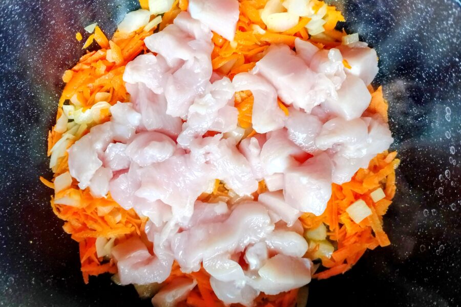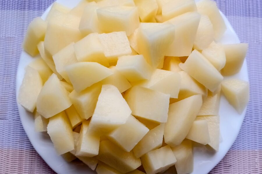 - In timp ce carnea cu legumele se gatesc, va puteti ocupa de cartofi. Trebuie decojiti si taiati cubulete mici. Cand carnea de pui se rumeneste usor, puteti turna toata apa. Adaugati cartofii in cratita.