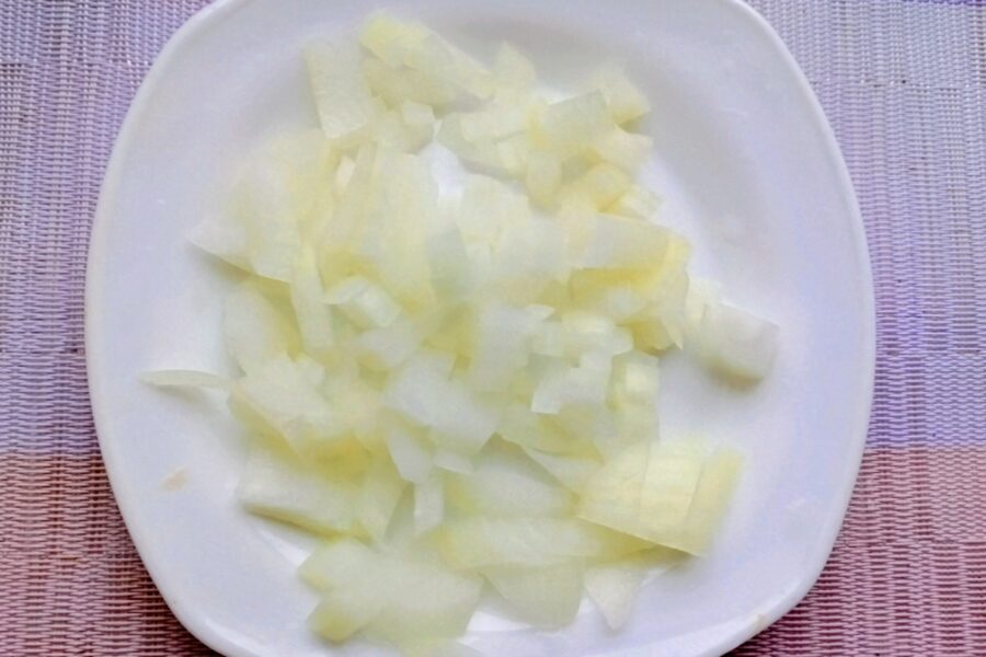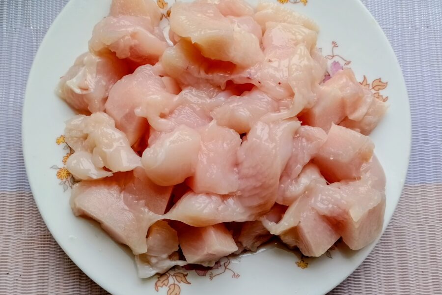- Spalati bine fileul de pui, apoi uscati-l si taiati-l in felii mici.