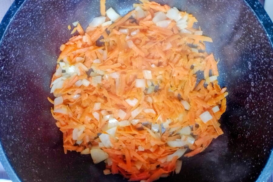 - Turnati uleiul intr-o cratita, adaugati ceapa si morcovul. Gatiti pana cand ingredientele se inmoaie.