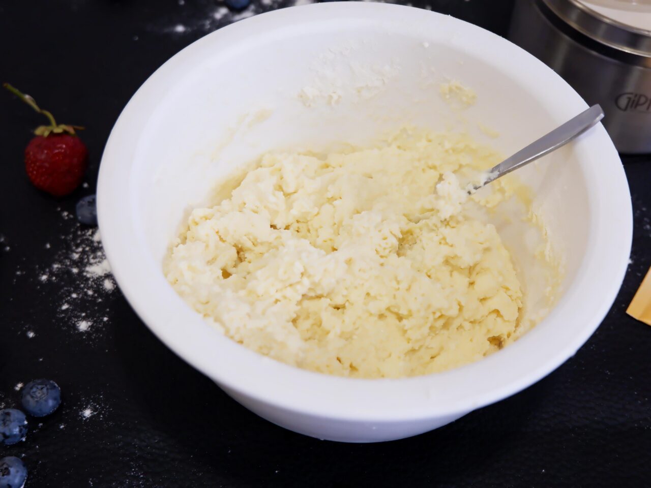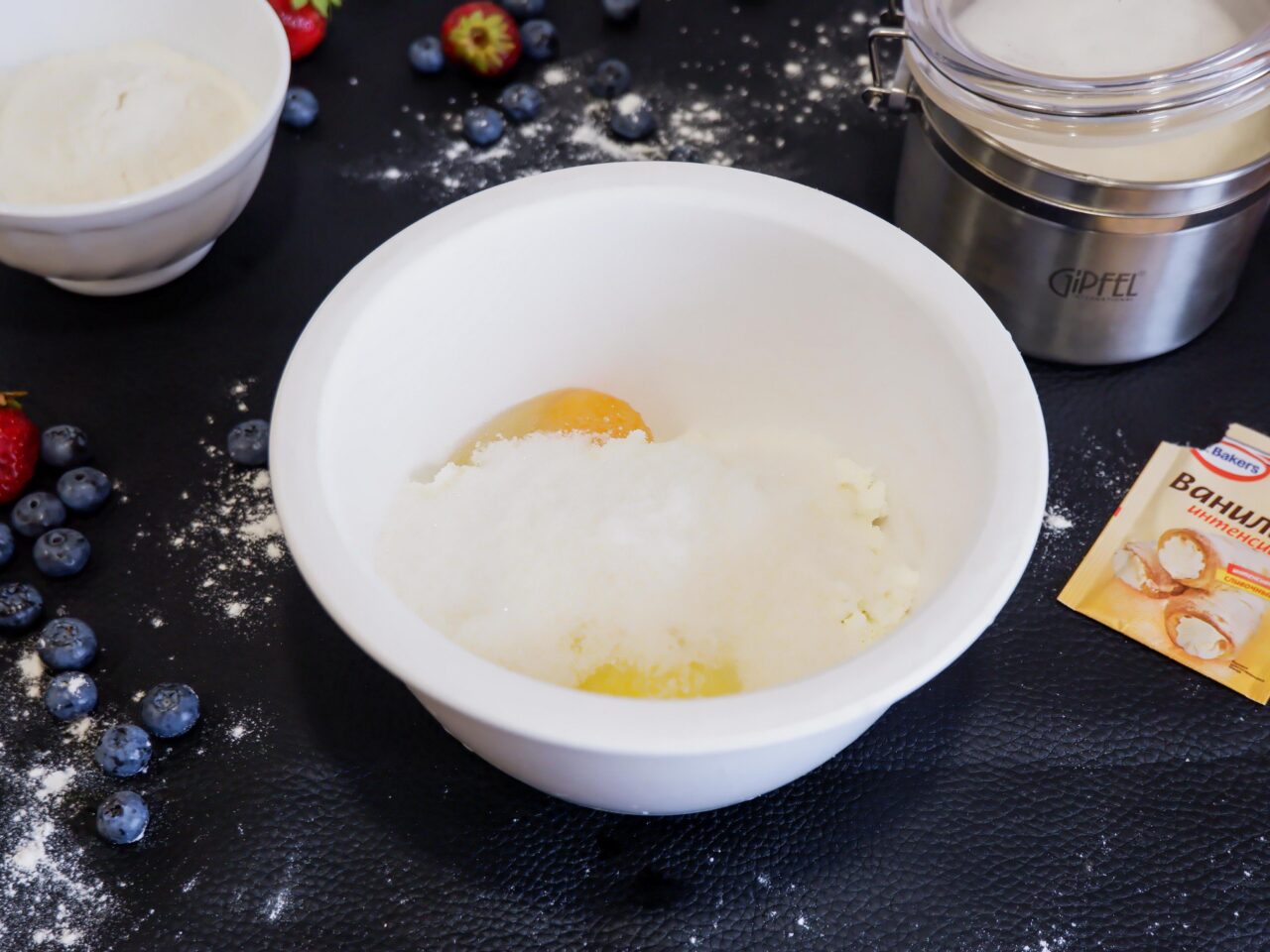 - Apoi adaugati faina cernuta si vanilia. Este important sa nu exagerati cu faina, deoarece syrniki vor pierde gustul de branza. In loc de faina, puteti folosi gris, dar daca folositi prea mult, preparatul va fi uscat.