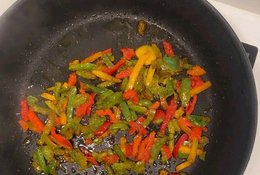 - Taiati in lung ardeii grasi, puteti folosi orice culoare doriti, eu am folosit de toate culorile cite un pic. Incingeti o tigaie cu putin ulei, si prajiti ardeii timp de 5 minute.