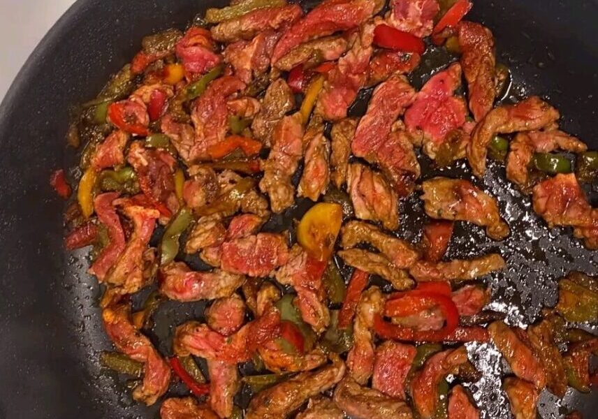 - Taiati marunt carnea de vita, si o adaugati in tigaia cu ardei. Adaugati : sare, piper macinat, boia de ardei dulce, cimbru, usturoi si ghimbir macinat. Prajiti pana cand carnea va fi frageda.