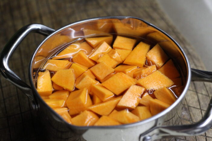 - Mai întâi trebuie să curățați dovleacul și să-l clătiți. Tăiați pulpa de dovleac în cuburi și adăugați apă, astfel încât lichidul să acopere bucățile de dovleac. Amestecul se pune pe foc și se fierbe până când dovleacul este pe jumătate fiert.