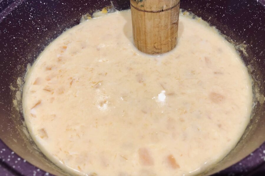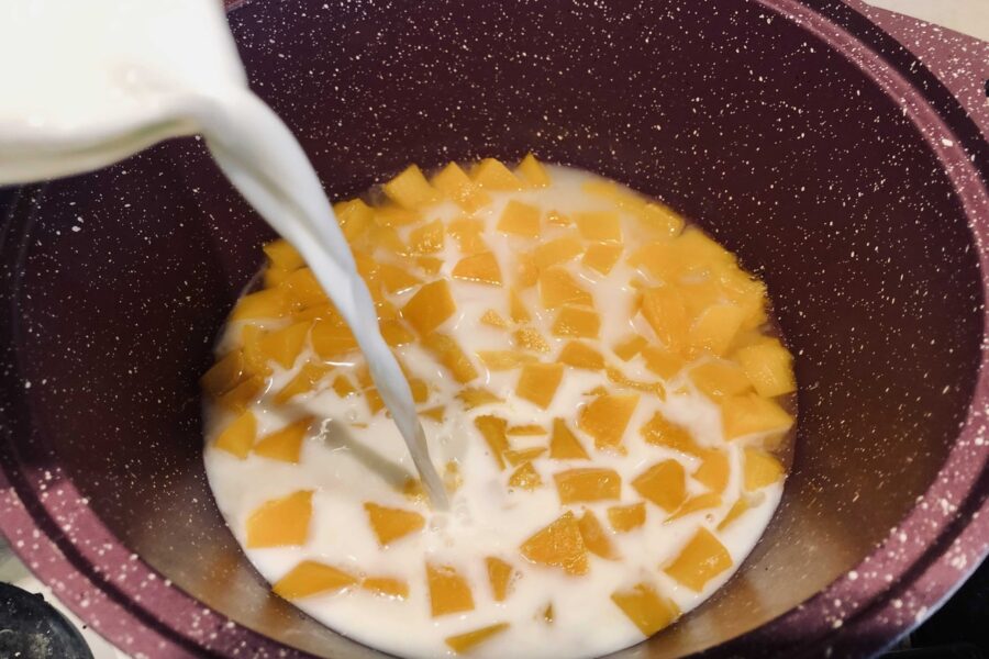 - Adăugați laptele fierbinte la dovleac și sarea.