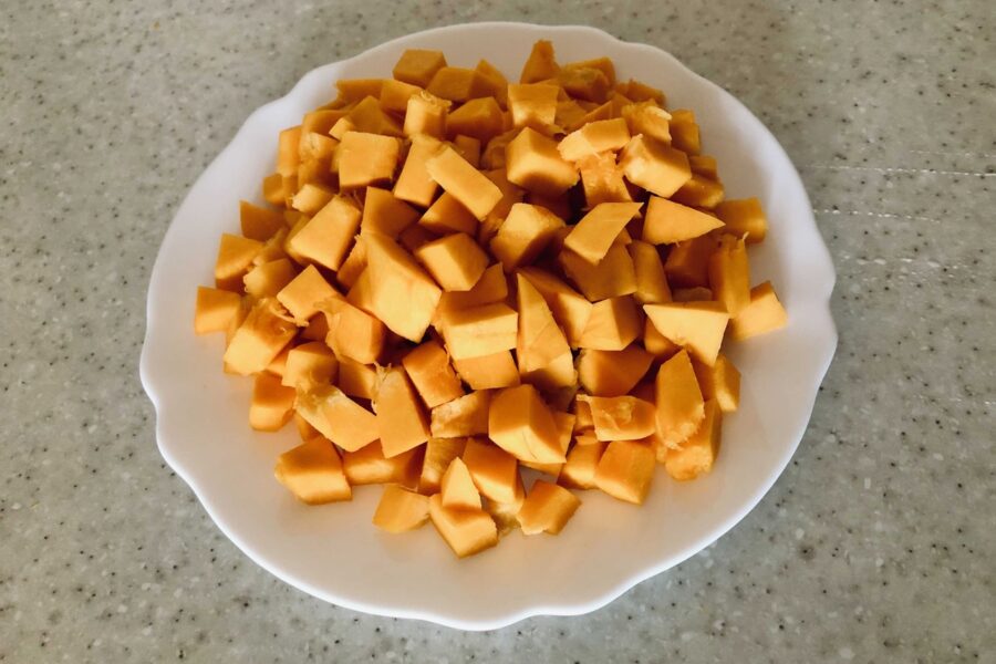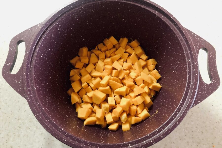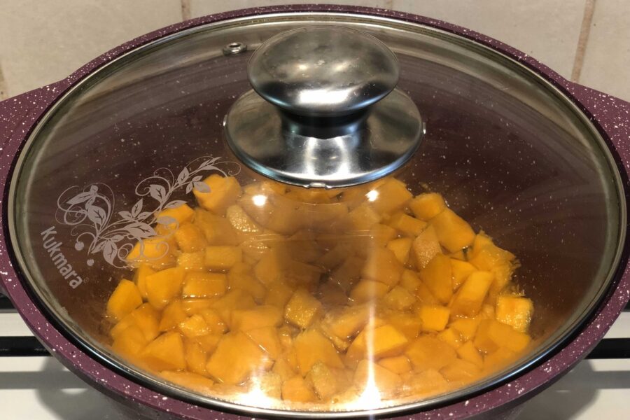 - Se pune la aburi sub un capac, la foc mic, până se înmoaie. Pentru ca dovleacul să se gătească mai repede, îl puteți da inițial pe răzătoare, în loc să îl tăiați în bucăți.