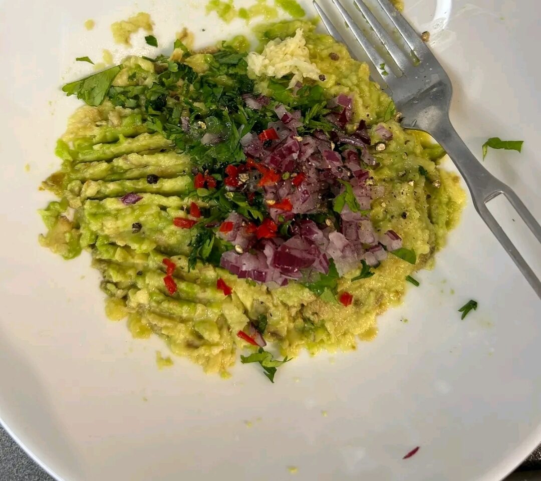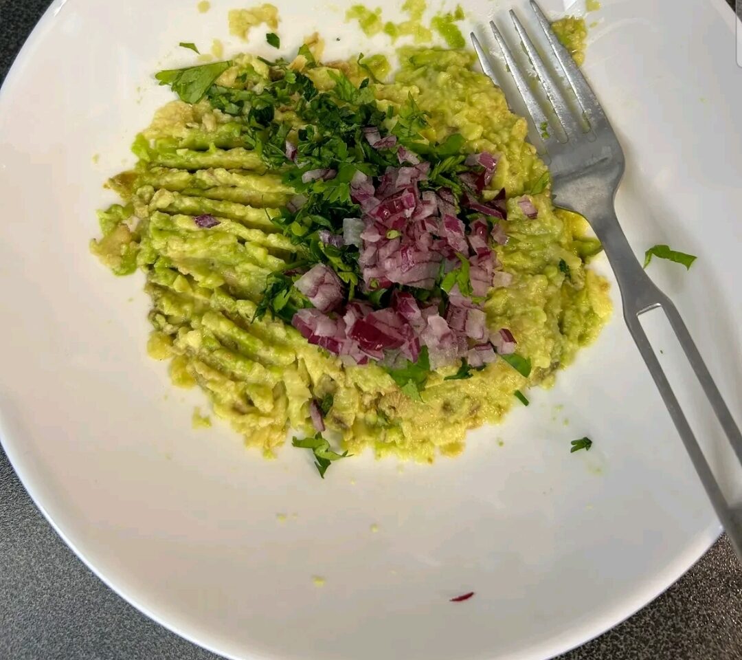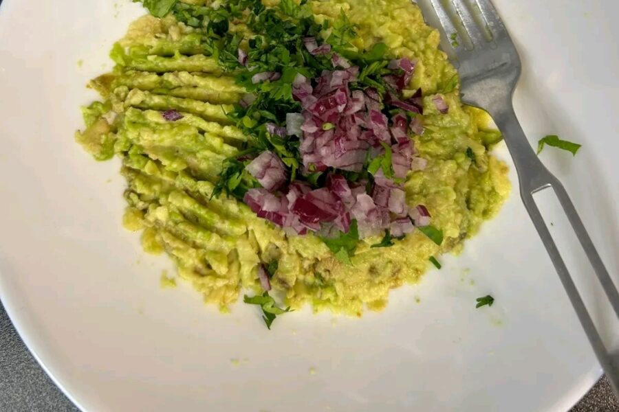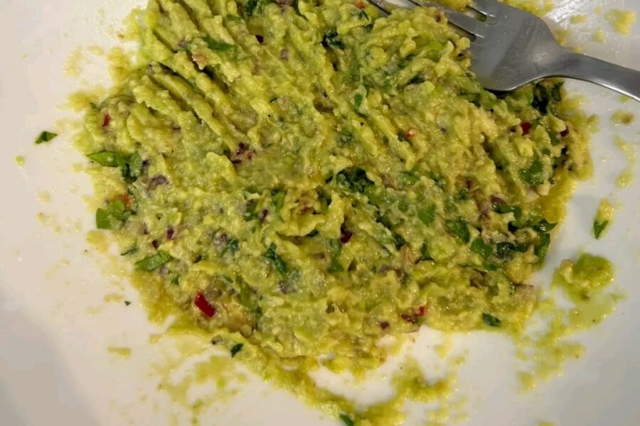 - Presati avocado-ul cu o furculita, si adaugati ceapa taiata marunt, patrunjelul si coriandrul taiat.