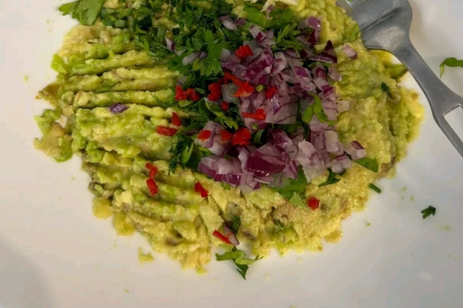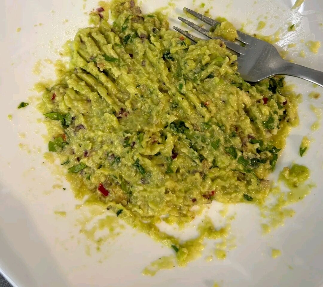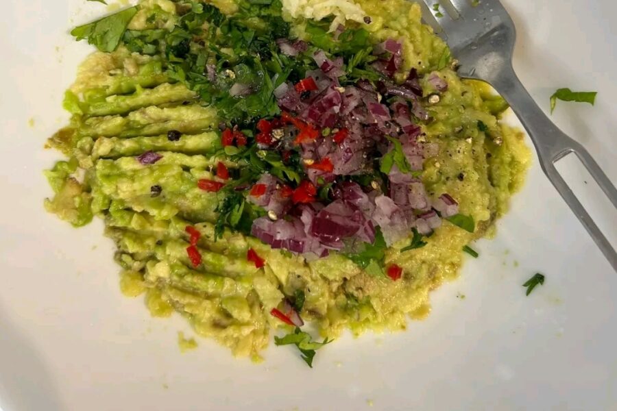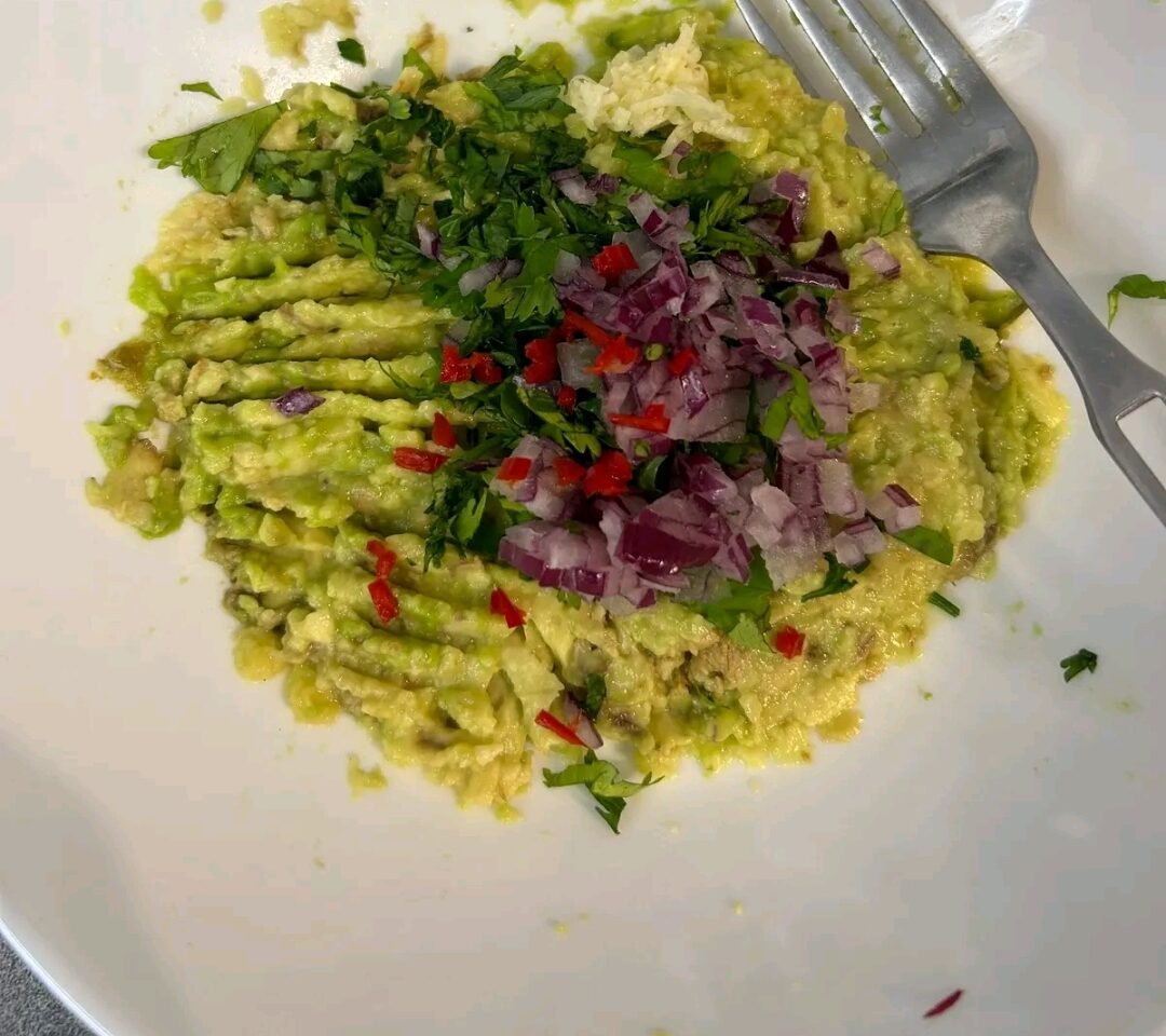 - Presati avocado-ul cu o furculita, si adaugati ceapa taiata marunt, patrunjelul si coriandrul taiat.