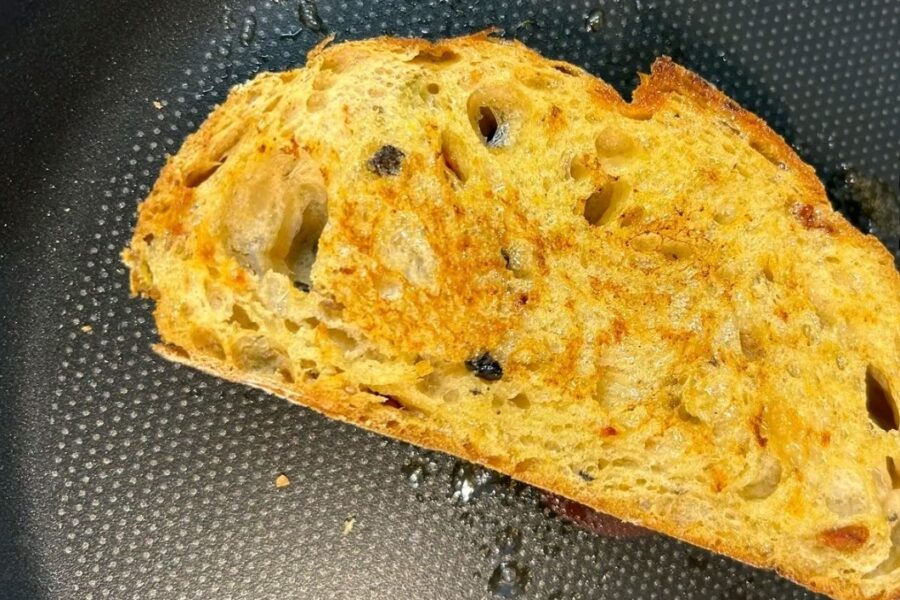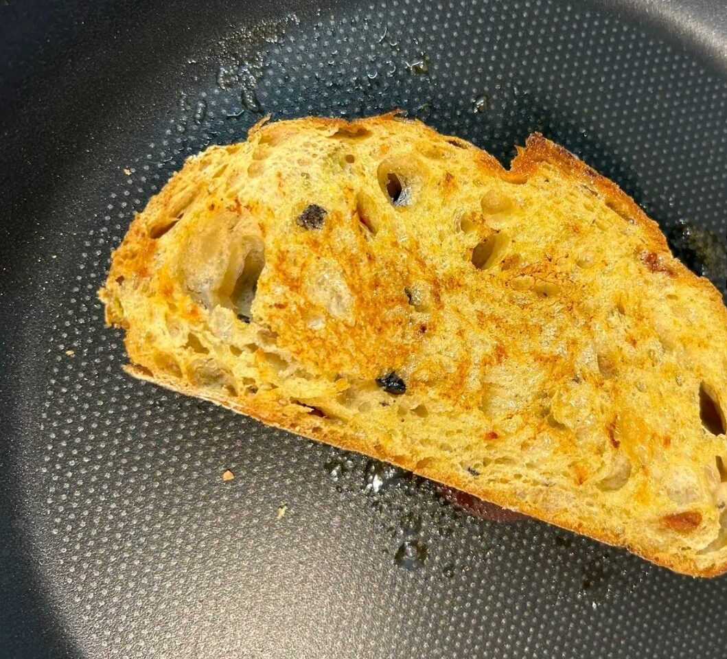 - Prajiti o felie de paine cu putin ulei intr-o tigaie. Apoi adaugati compozitia pregatita pe paine. Se poate servi si asa dar daca doriti puteti fierbe doua oua si le dati pe razatoare, apoi puneti deasupra compozitiei din avocado.