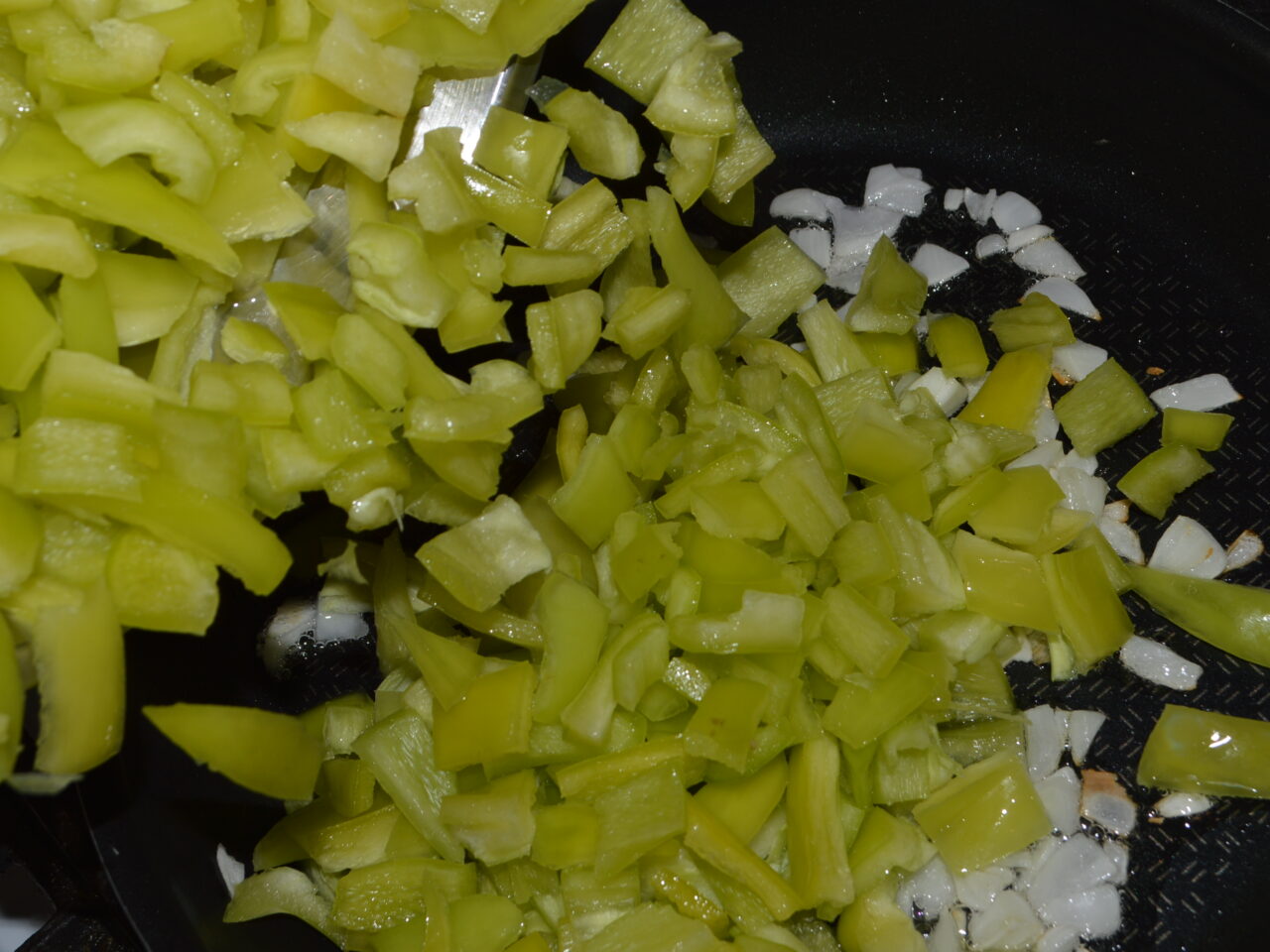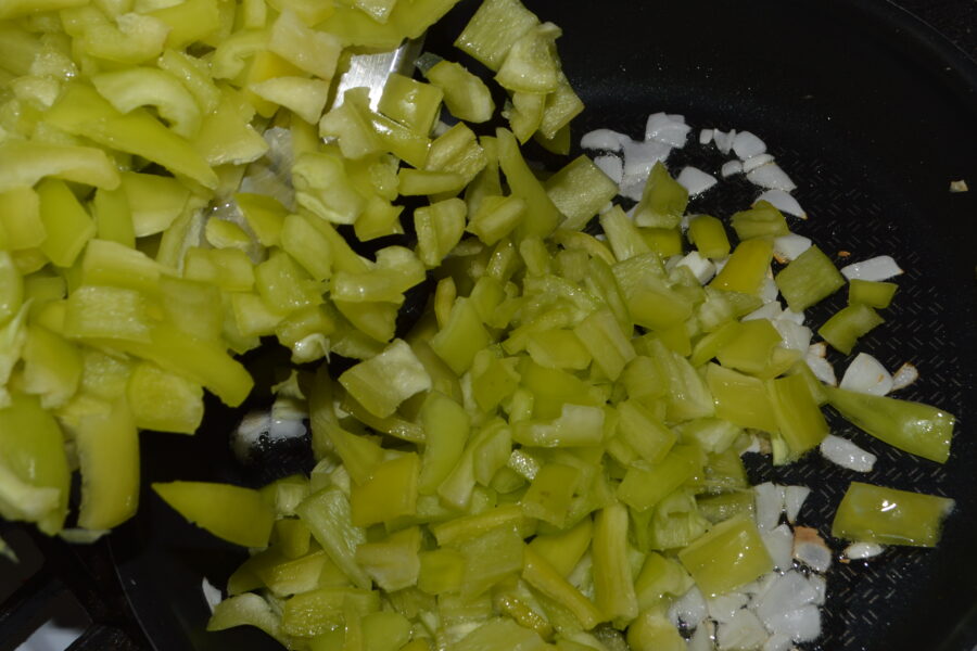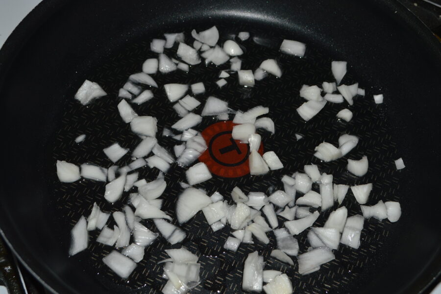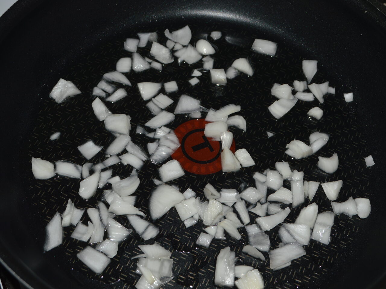 - Intr-o tigaie turnati uleiul si caliti ceapa 1-2 minute la foc mic.