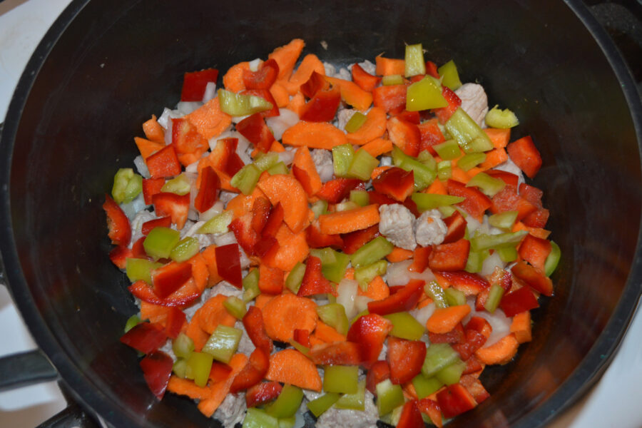 - Taiati ardeiul dulce si gogosarul, si adaugati-i in ceaun. Turnati putin ulei, si gatiti la foc mic timp de 10 minute.