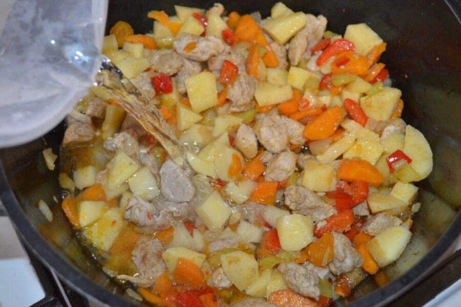 Tocanita de cartofi cu carne de porc si legume, preparata la ceaun este foarte gustoasa. Puteti folosi orice fel de carne de porc, eu am folosit muschi.