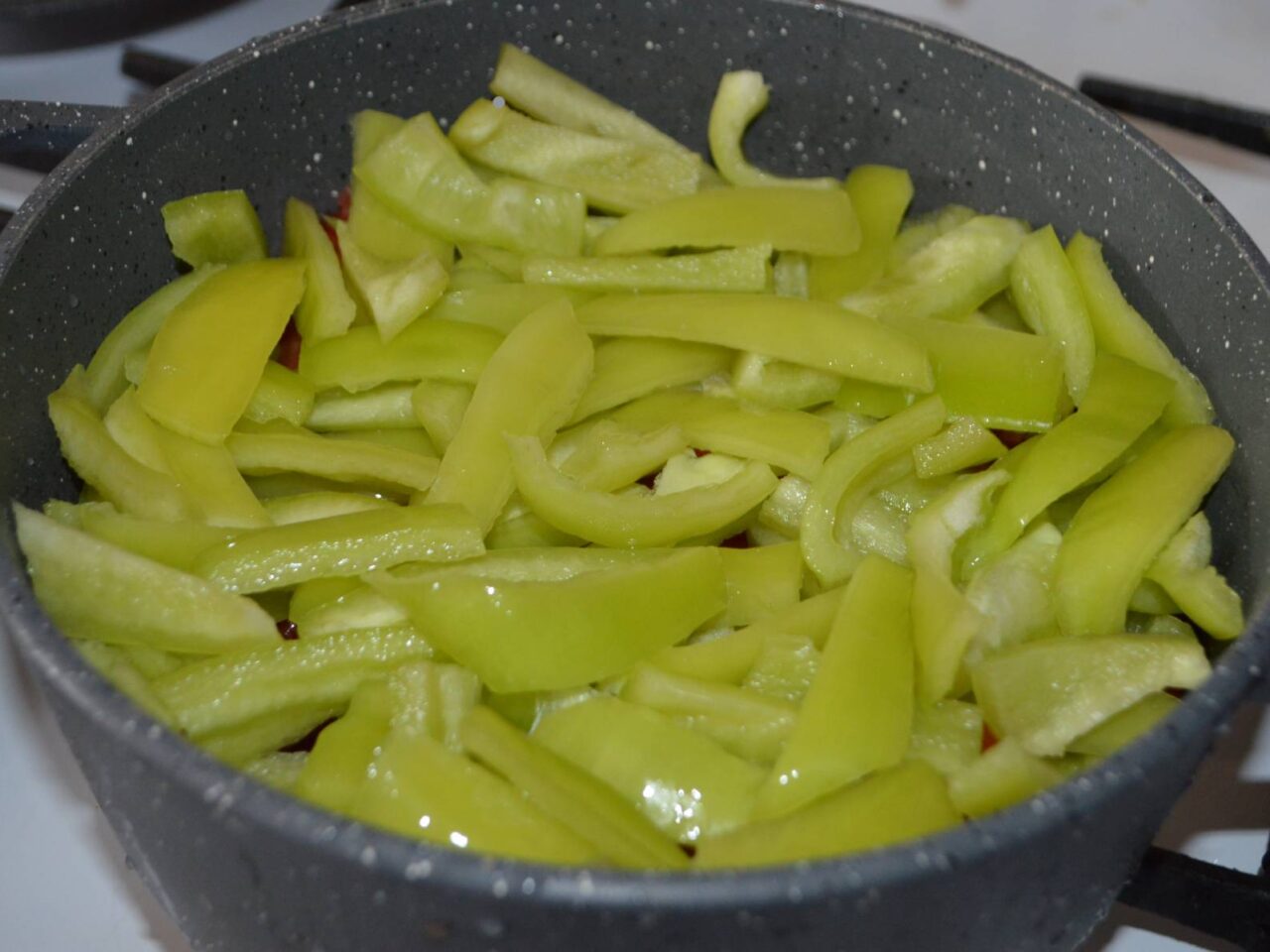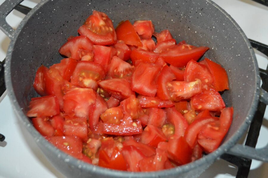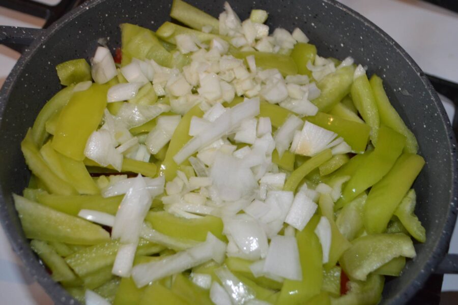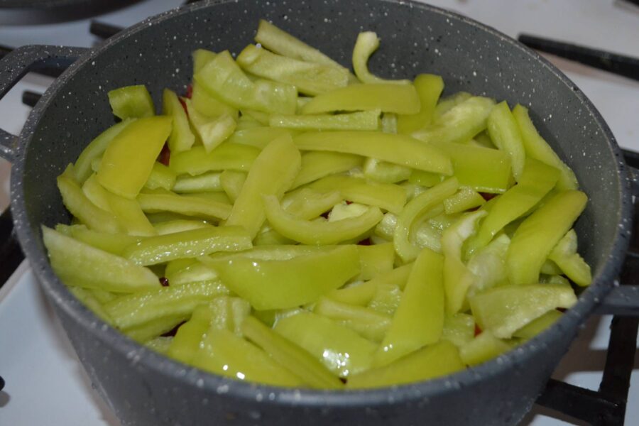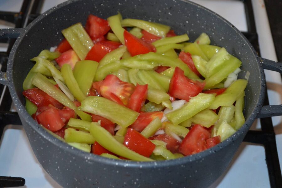 - Taiati ardeii , si adaugati-i peste rosii. Puteti folosi orice culoare de ardei, nu difera daca e ardei capia sau ardei gras.
