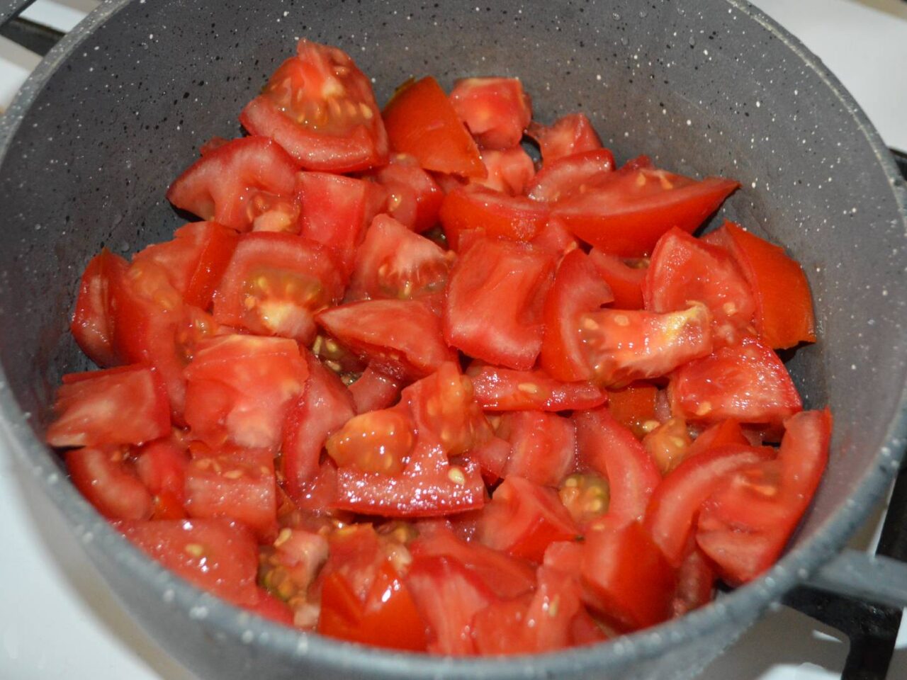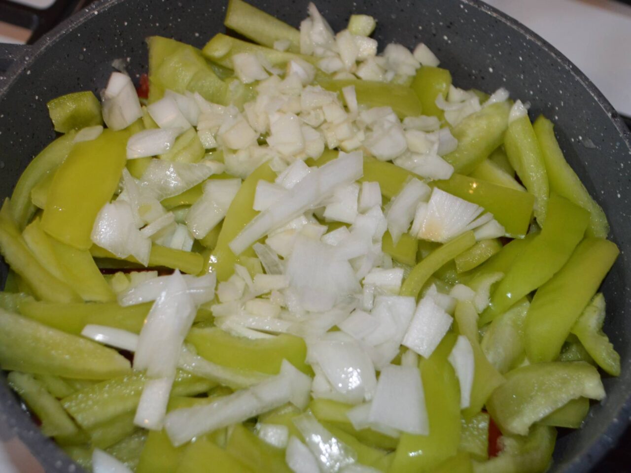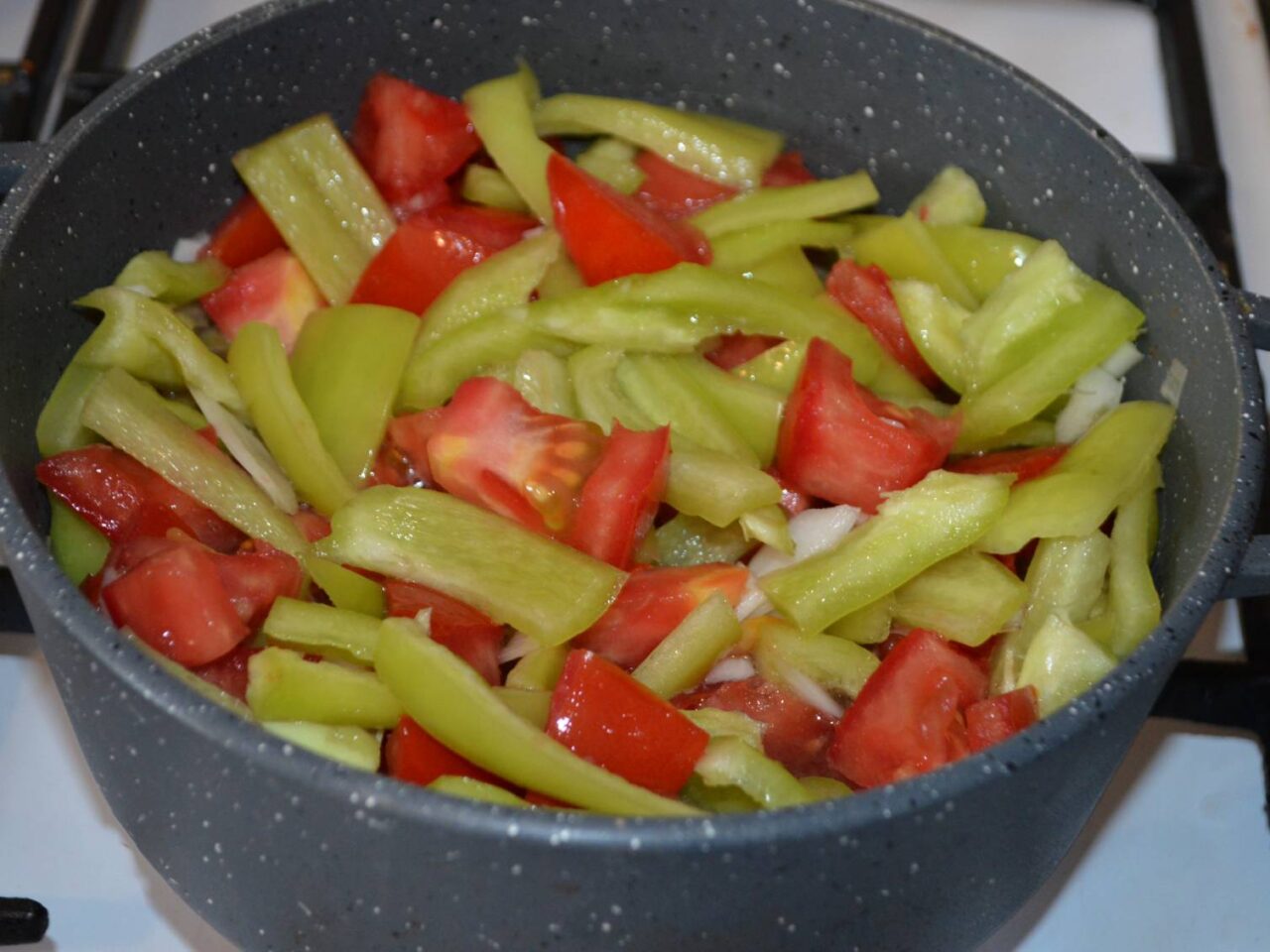 - Taiati ardeii , si adaugati-i peste rosii. Puteti folosi orice culoare de ardei, nu difera daca e ardei capia sau ardei gras.
