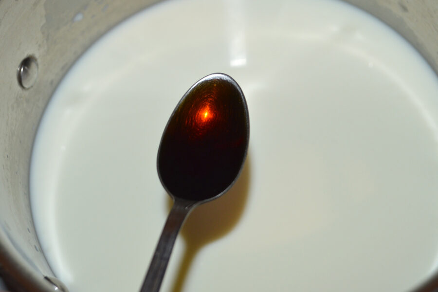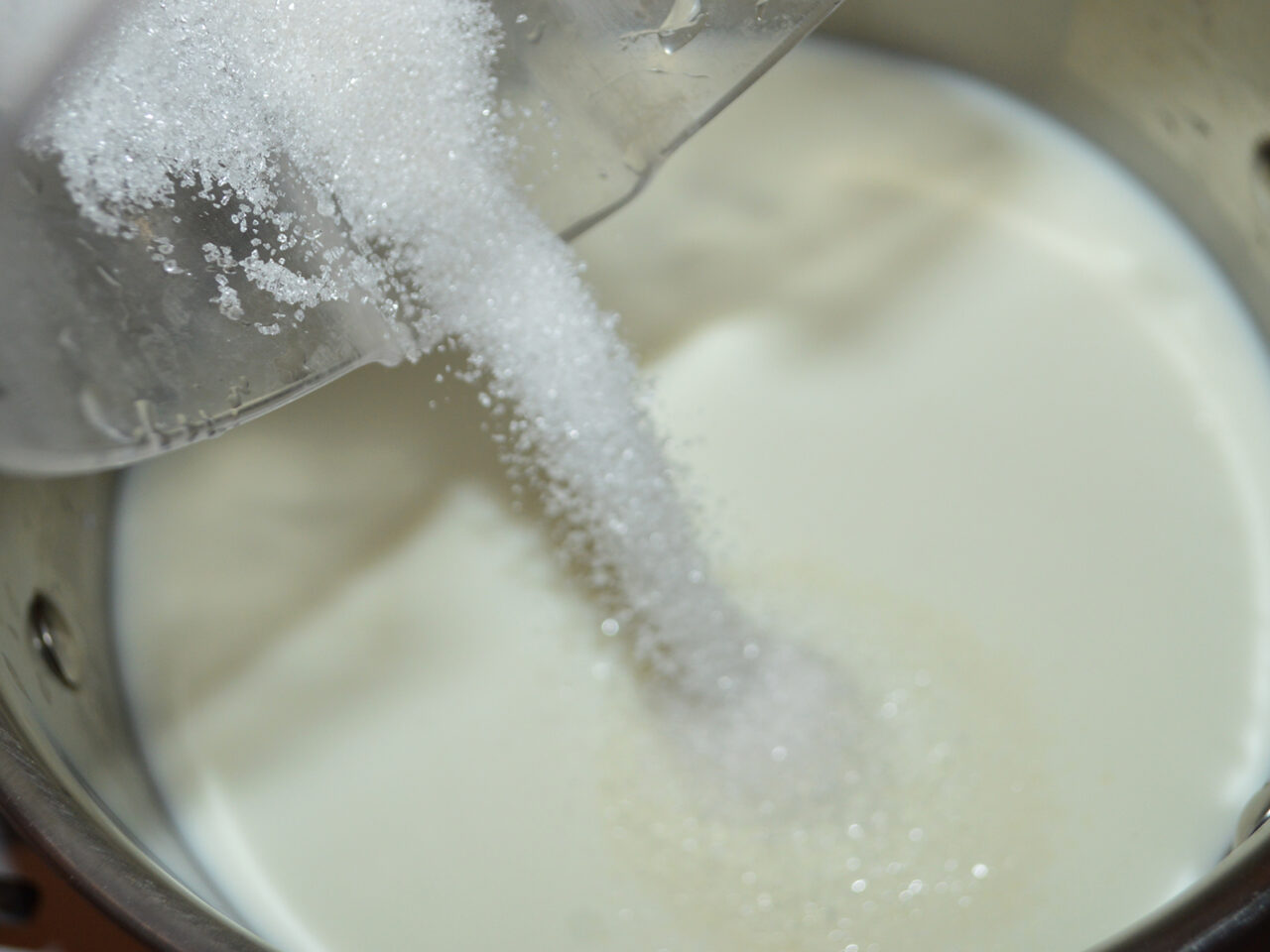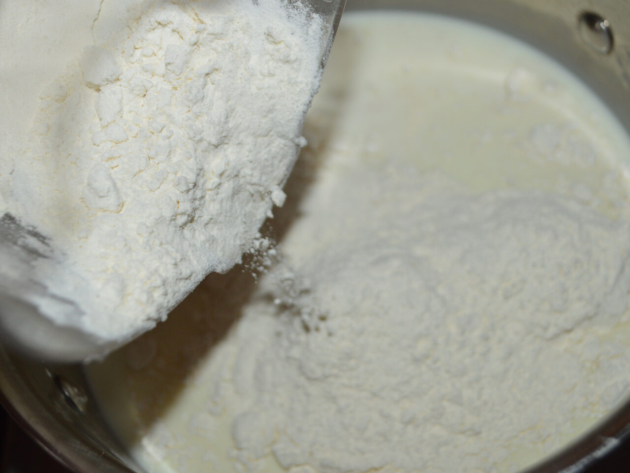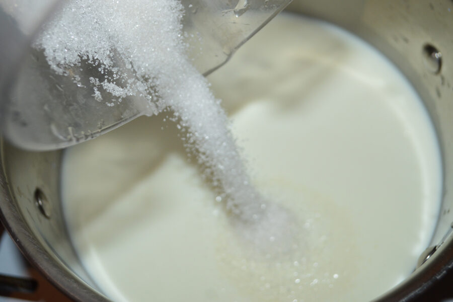 - Intre timp, preparati crema: turnati laptele rece intr-o cratita apoi adaugati zaharul.