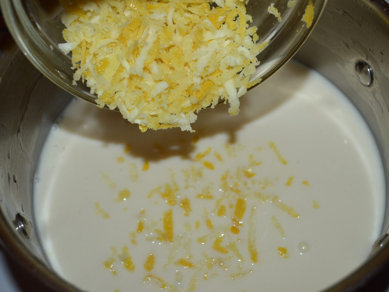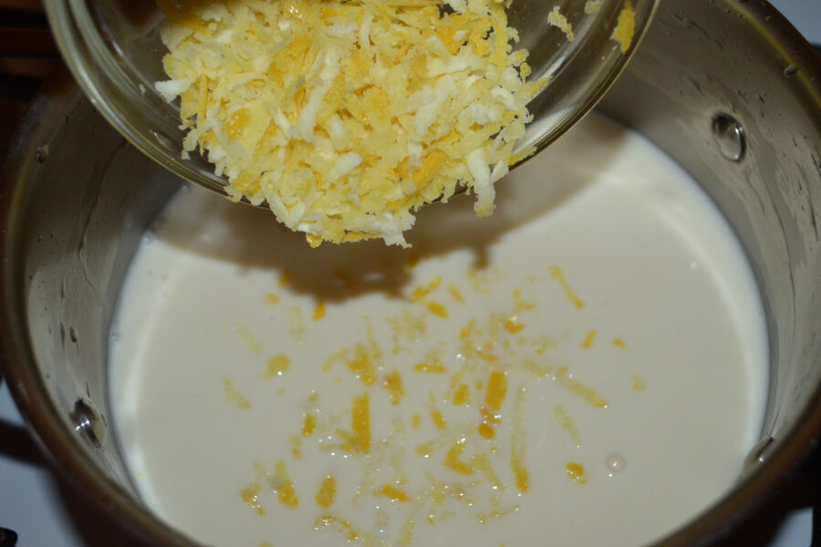 - Amestecati cu un tel, apoi adaugati coaja de la o lamaie rasa pe razatoare. Porniti focul si lasati la fiert, amestecand din cand in cand.