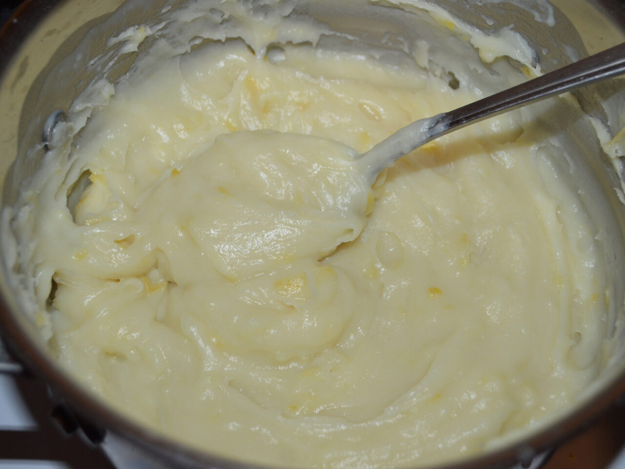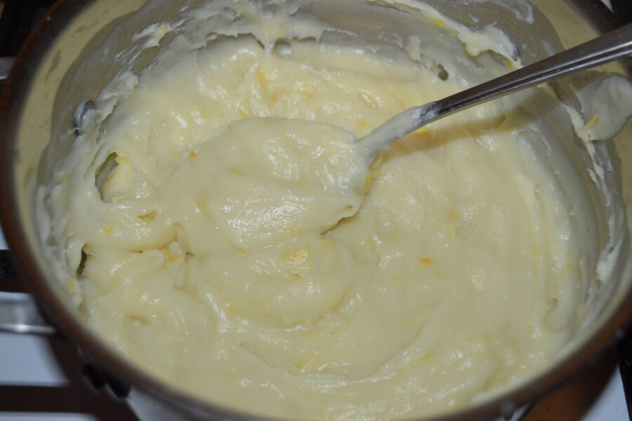 - Cand crema se incepe a ingrosa amestecati incontinuu pentru a nu se lipi, timp de inca 2 minute, apoi opriti focul. Lasati crema sa se raceasca complet.