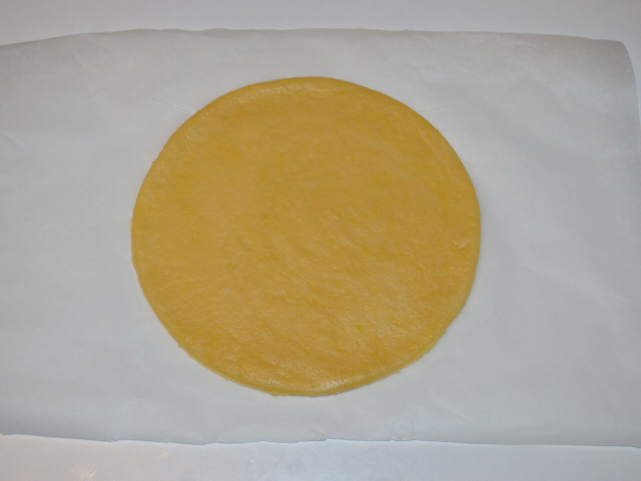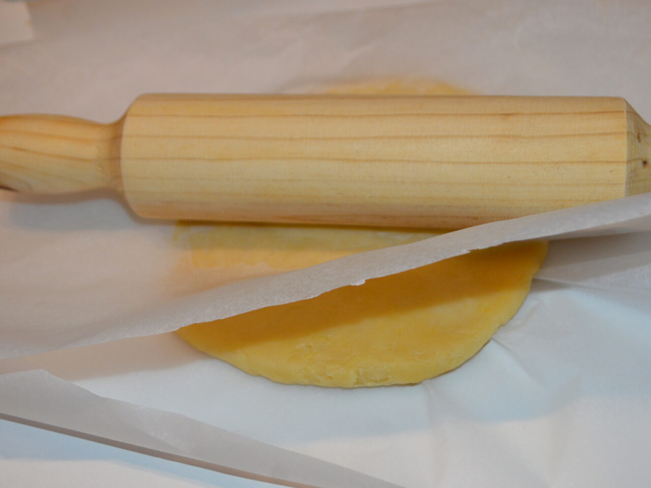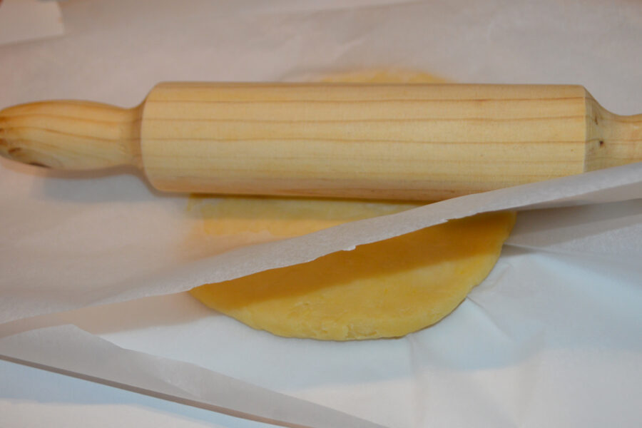 - Pentru a fi mai usor, taiati doua bucati de hartie de copt: una pentru a pune pe ea o bucata de aluat , iar a doua deasupra aluatului. Iar cu ajutorul sucitorului intindeti aluatul.