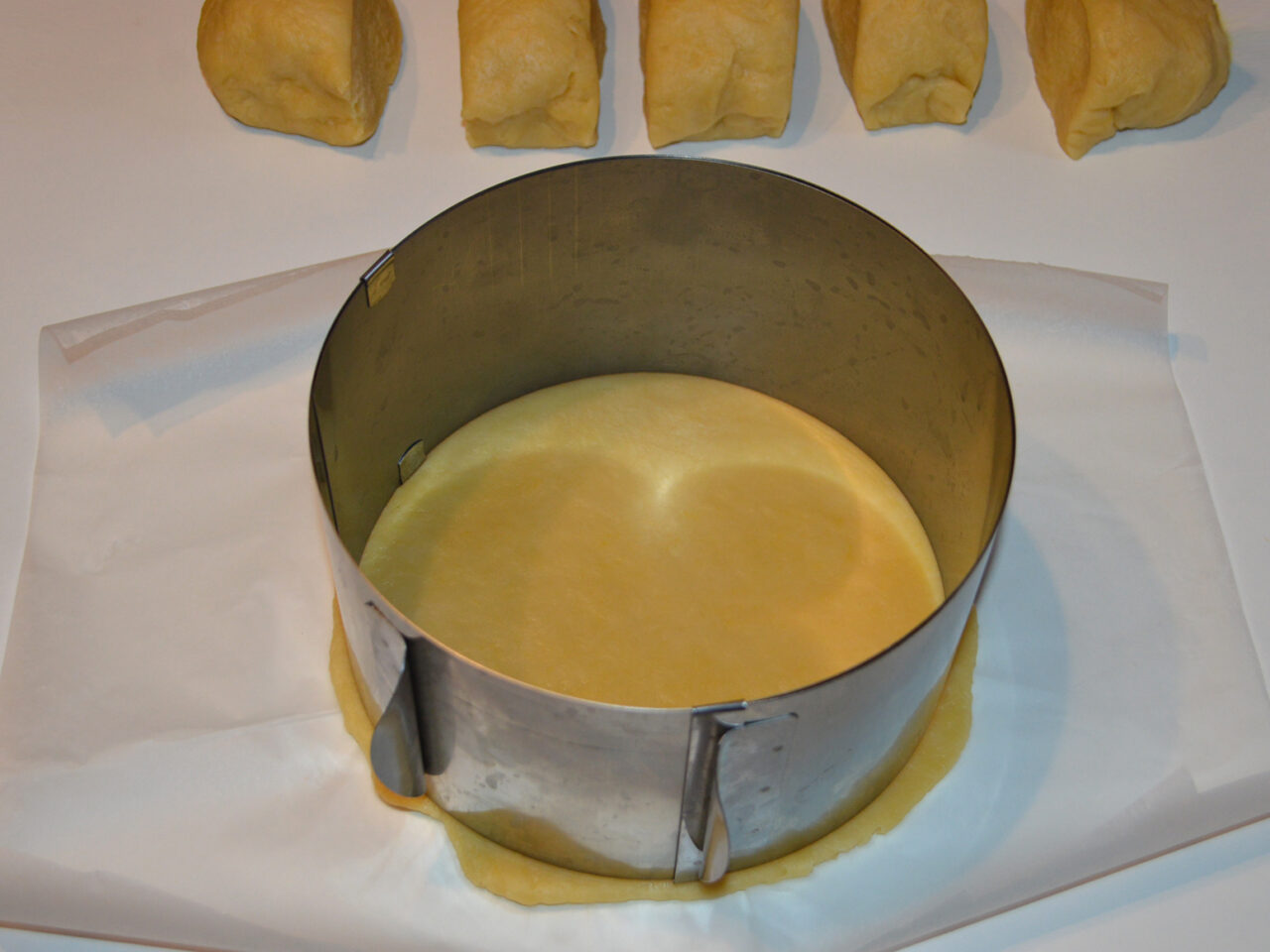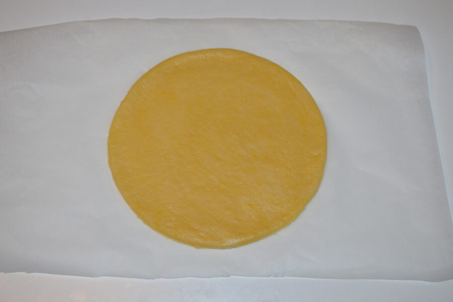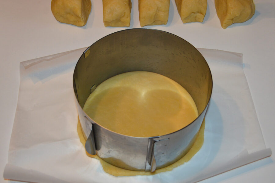 - Folositi o forma sau un inel de patiserie de 18 cm, si puneti deasupra aluatului intins.