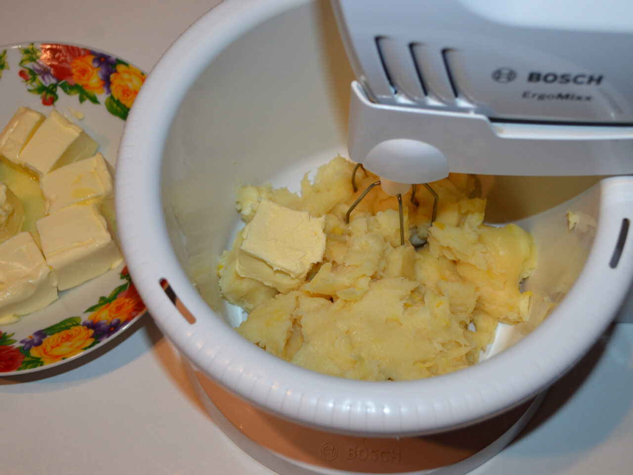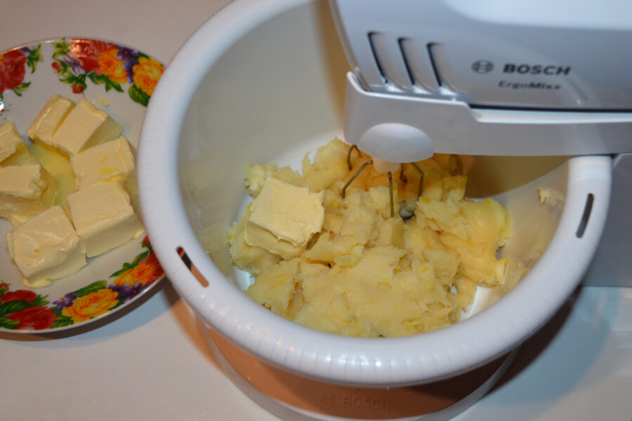 - Dupa ce crema s-a racit, o transferati intr-un castron si adaugati cate o bucata de unt moale, de temperatura camerei. Bateti cu mixerul, si treptat mai adaugati cate o bucata de unt pana il puneti pe tot.