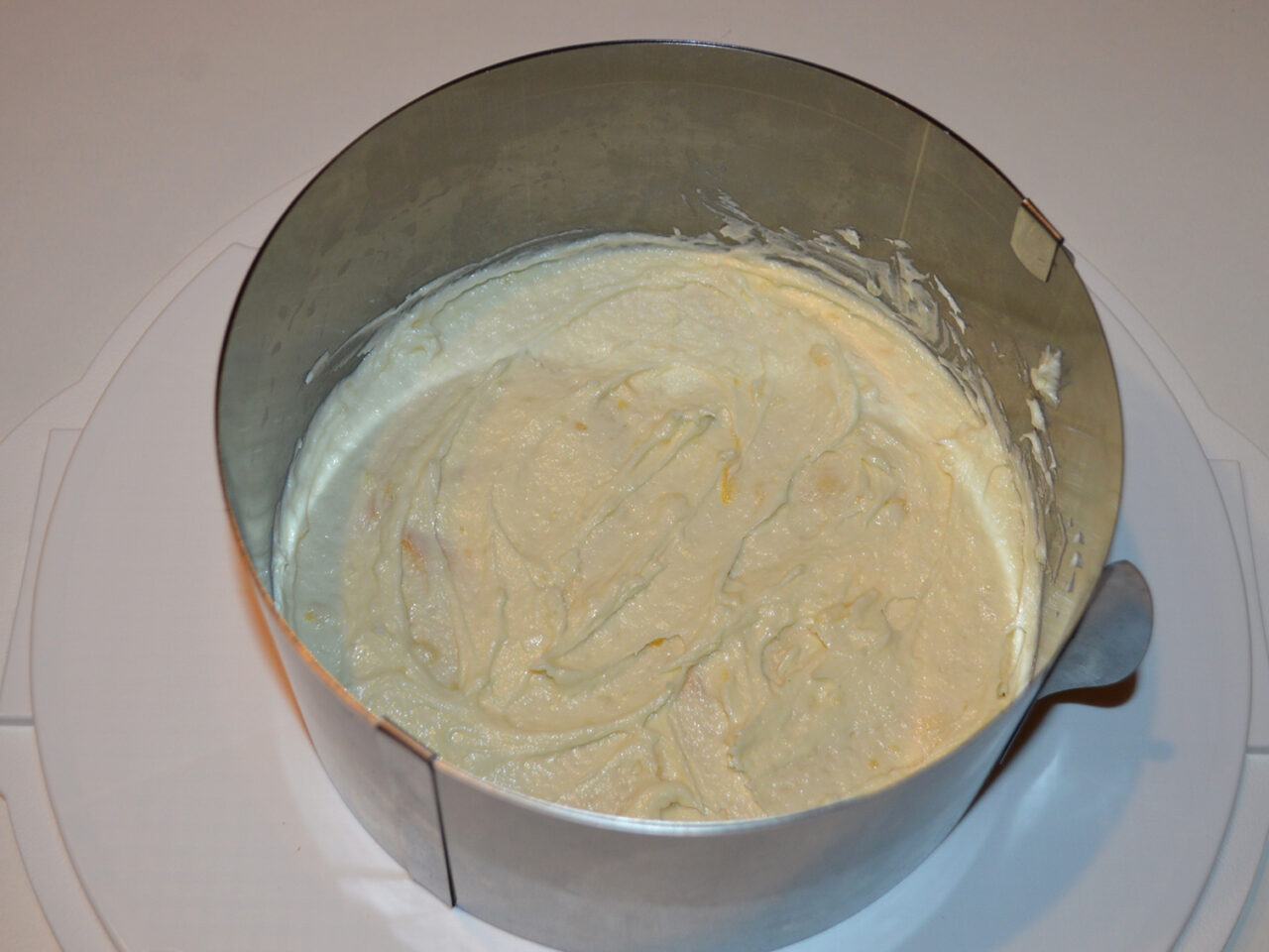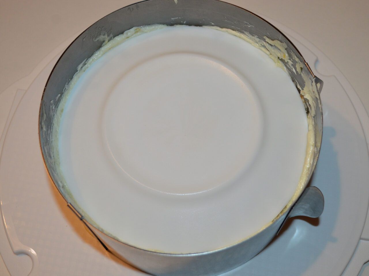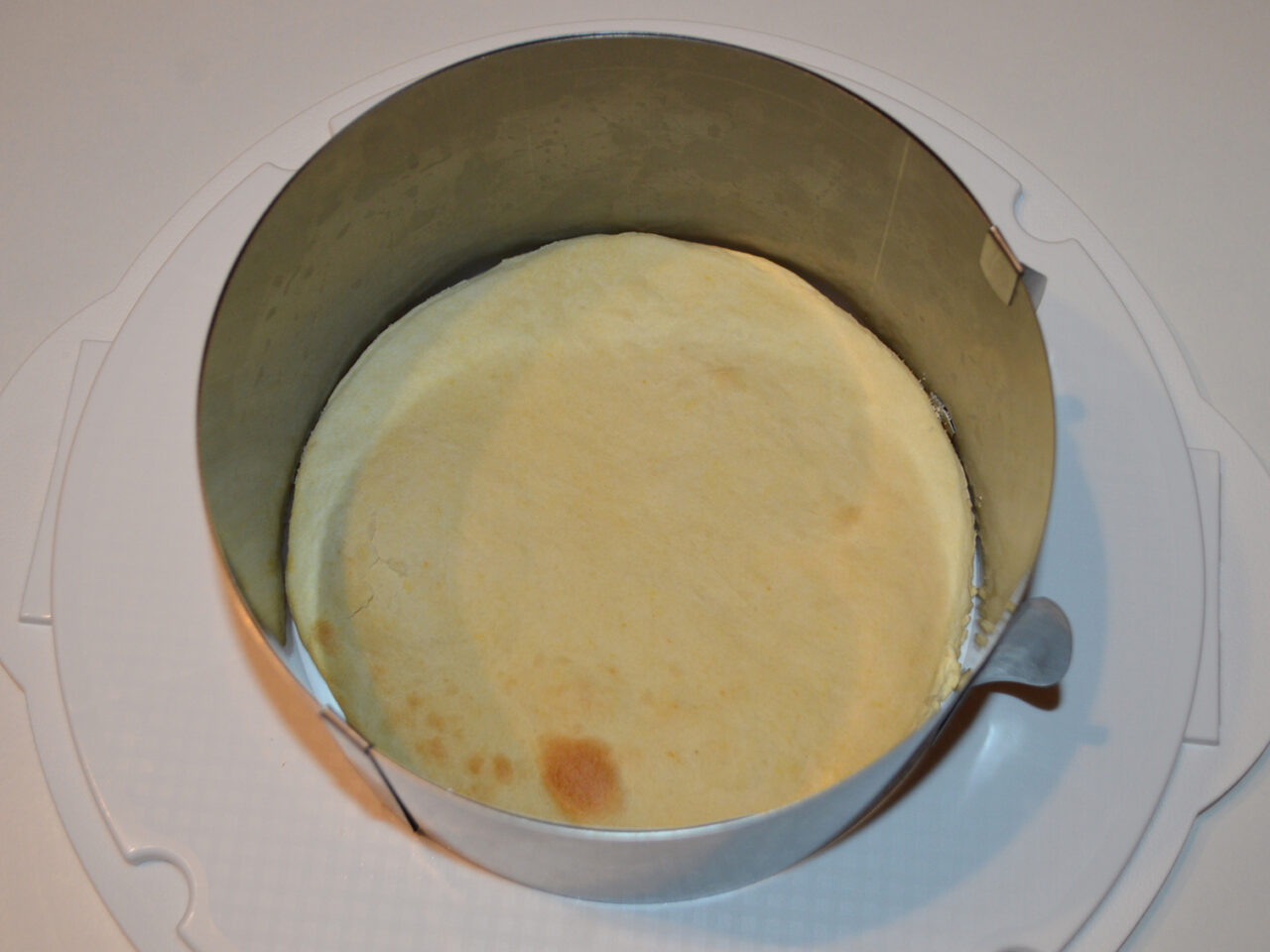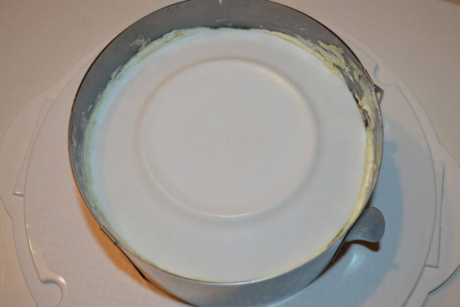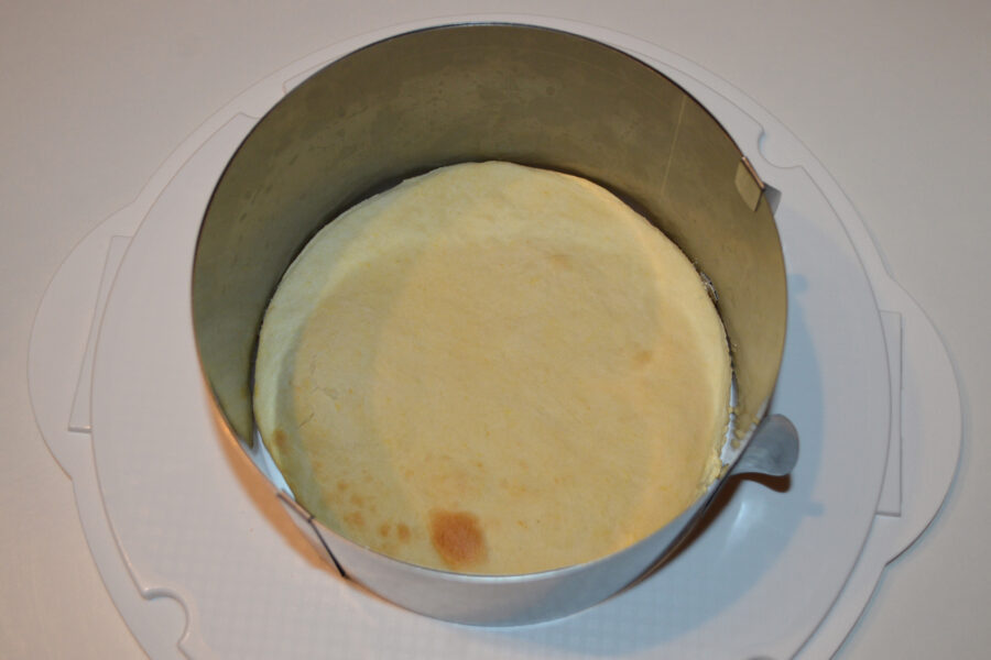 - Ansamblarea tortului: puneti inelul de patiserie pe un platou sau farfurie in care va fi tortul, si puneti prima foaie inauntru.