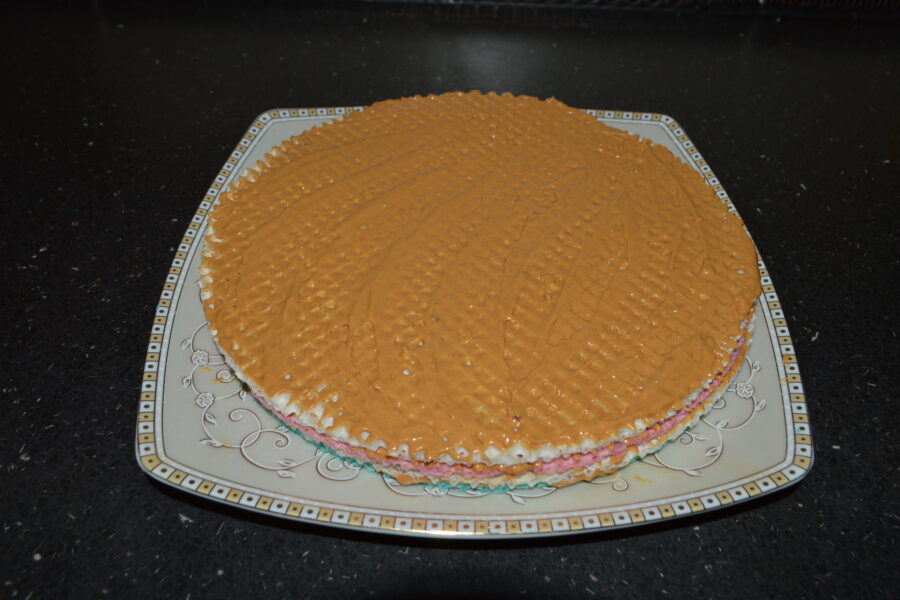 Daca doriti sa improvizati o varianta mai originala de tort cu vafe, puteti folosi fulgi de cocos sau ciocolata rasa pentru un decor mai fin.
