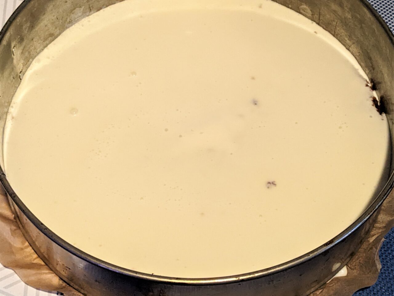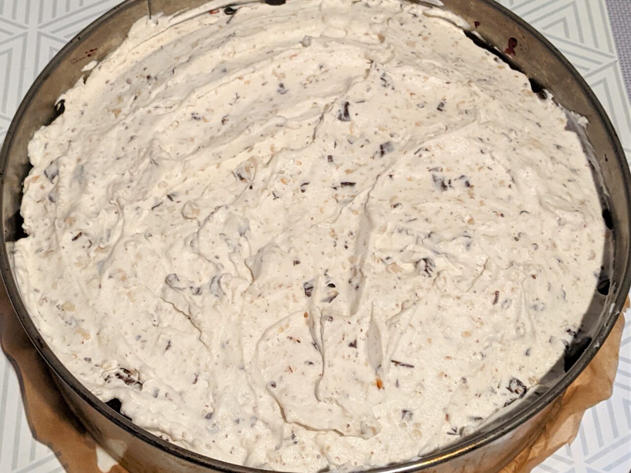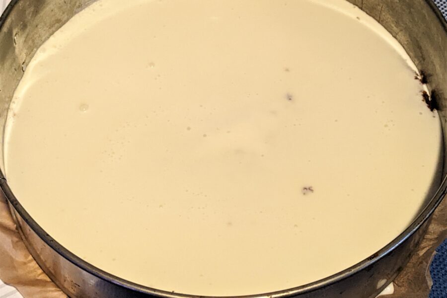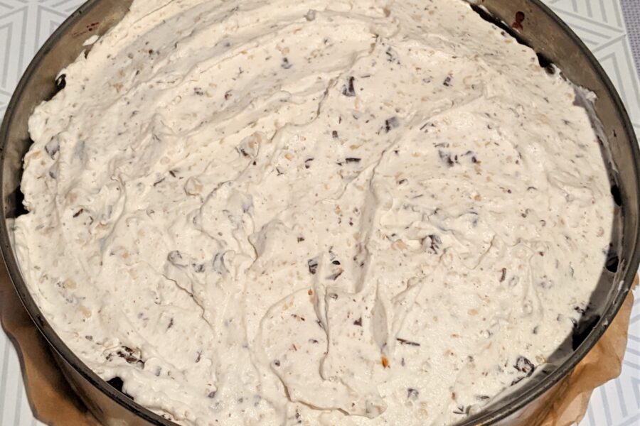 - Turnati gelatina cu apa (50 ml). Se adauga apoi laptele, zaharul si se incalzeste laptele pana se dizolva gelatina si zaharul. Se toarna smantana si se amesteca bine. Se raceste pana la temperatura camerei. Fixati hartia in forma. Puneti un blat pe fund. Nu este nevoie sa înmuiati blaturile. Turnati amestecul de lapte-gelatina peste blatul de jos si puneti imediat forma in frigider.