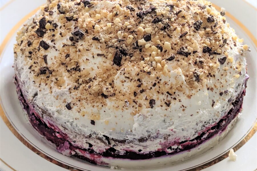 Tort delicios in straturi, cu crema pufoasa, usor acrisor de fructe de padure si nuci crocante. Puteti coace blaturile de ciocolata dupa propria retetă sau puteti folosi aceasta reteta magica pe care v-o prezint eu.