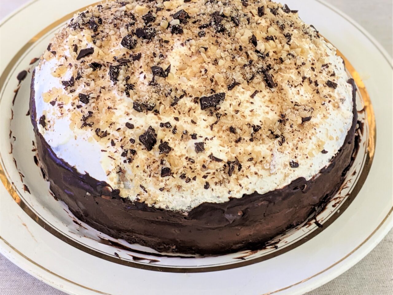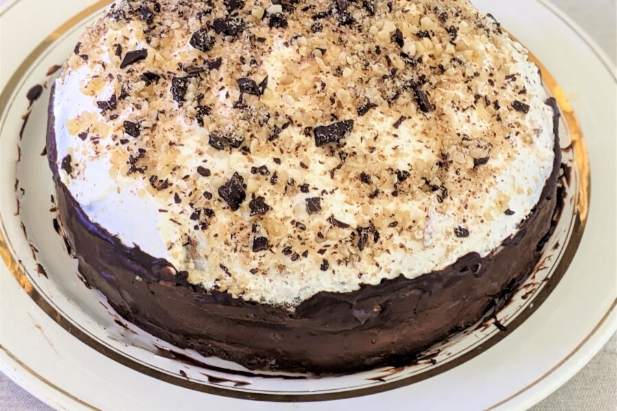 - Acoperiti tortul cu crema ramasa si presarati cu nuci. Dati tortul la frigider pentru cateva ore. Indepartati peretii si fundul formei de pe tort si transferati tortul pe un platou direct cu hartia.