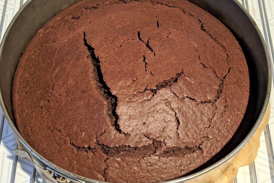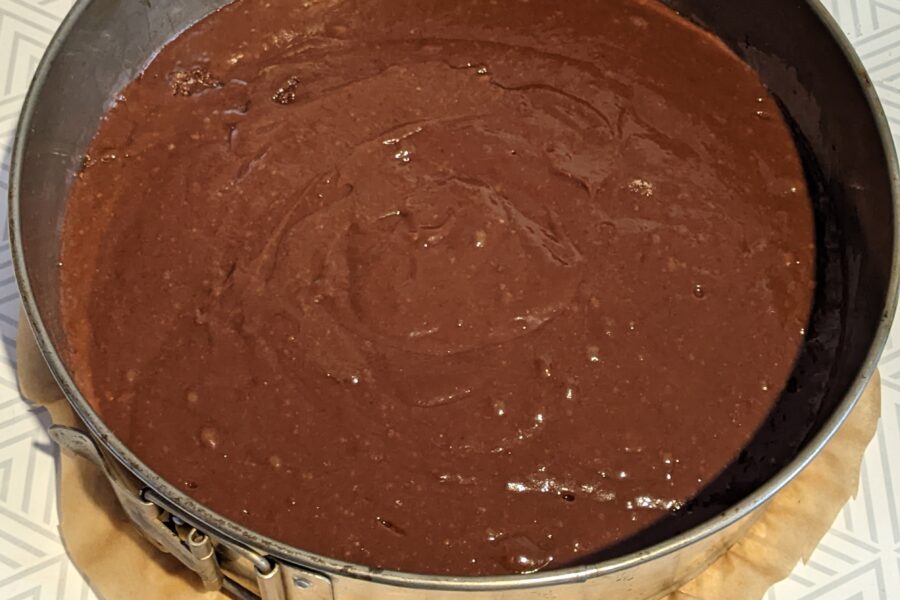 - Tapetati forma (24 cm) cu hartie de copt, turnati compozitia de si coaceti in cuptor la 180° timp de 40 de minute.