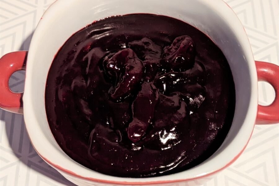 - Adaugati zaharul si amidonul diluat cu apa la piureul de fructe de padure si fierbeti pana se ingroasa. Se raceste si se acopera cu folie alimentara.