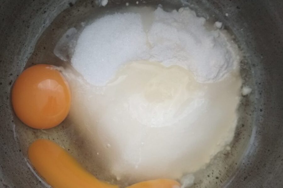 - Pentru a pregăti crema într-o cratiță, se amestecă făina cu zahărul obisnuit si cel vanilat, se bat ouăle și se frământă totul până se obține o masă omogenă.