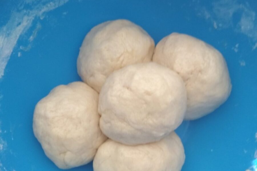 - Se împarte aluatul în 6 porții (se rulează în bile) și se lasă la rece timp de 4 ore.