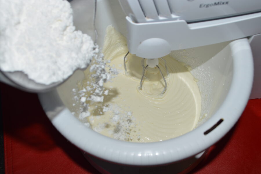 - Prepararea cremei: puneti smantana intr-un bol, si adaugati zaharul pudra. Mixati.