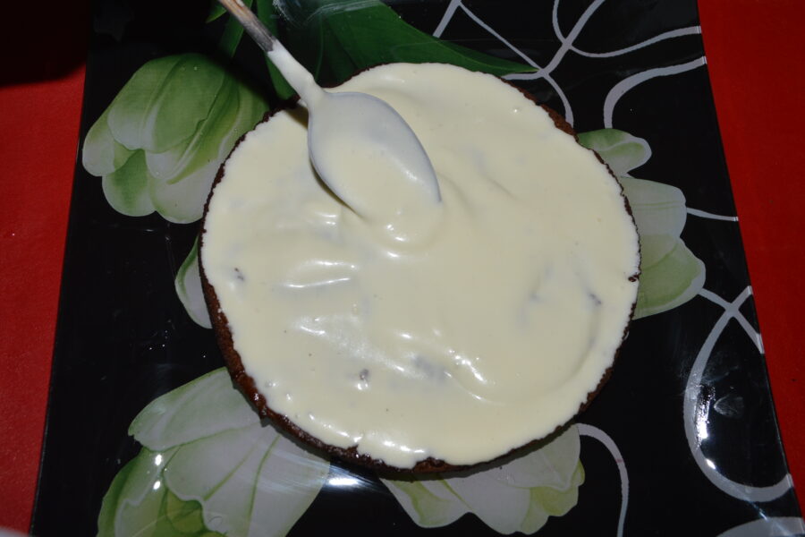 - Taiati pandispanul in 3 bucati, si incepeti a ansambla tortul. Intii inmuiati fiecare blat (200 ml apa+1 lingurita de zahar), apoi ungeti cu crema.