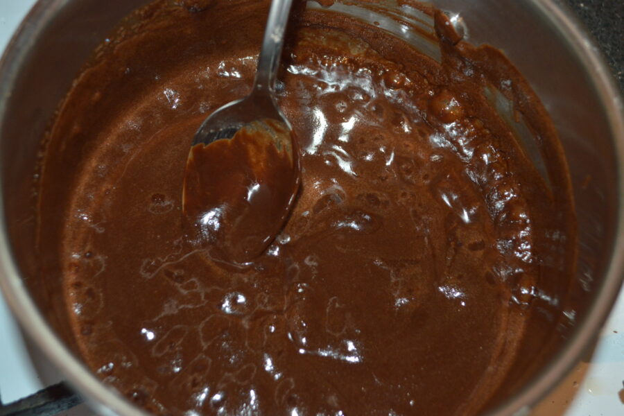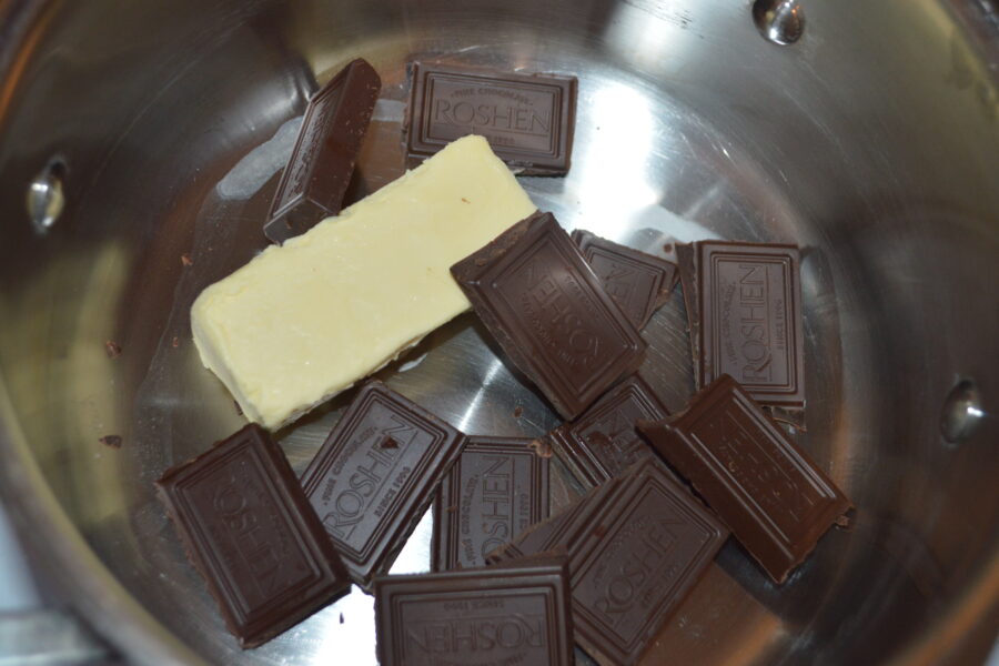 - Porniti aragazul la foc mic, si topiti untul cu ciocolata amestecand intruna.