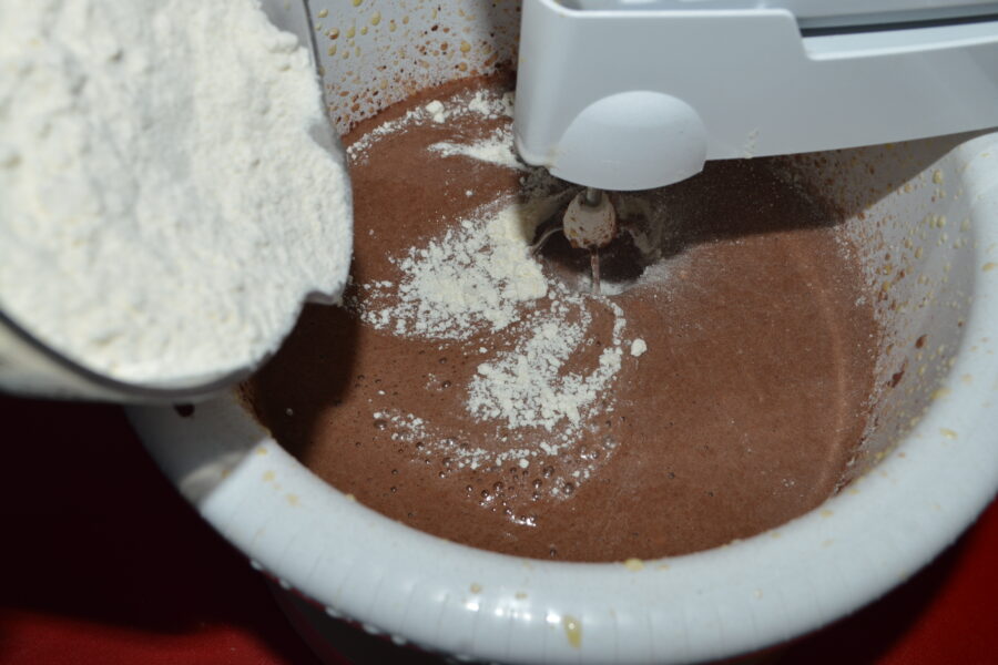 - Apoi adaugati faina, si bateti cu mixerul la viteza mica pana se omogenizeaza.