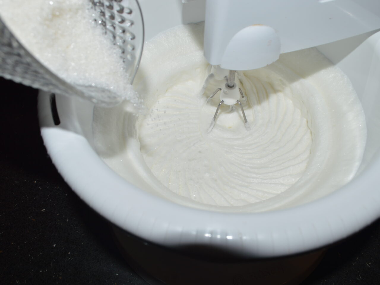 - Bateti albusurile cu mixerul pana se face spuma tare, apoi adaugati 60 de gr de zahar in ele, si mixati mai departe.