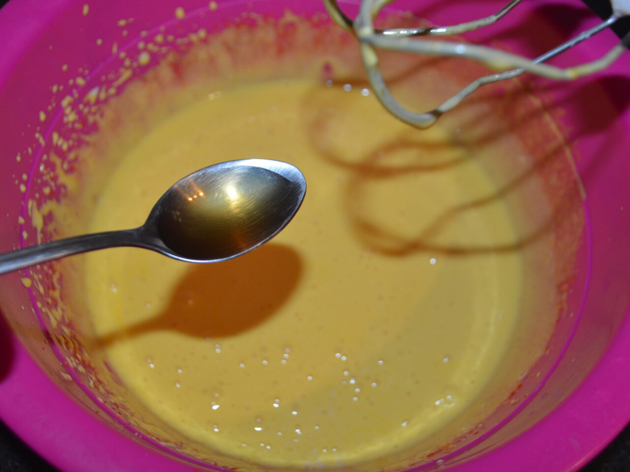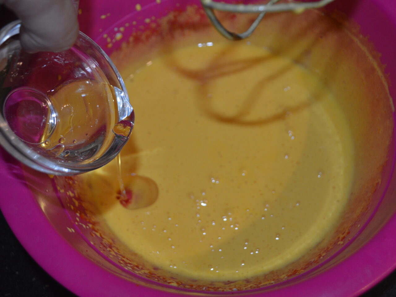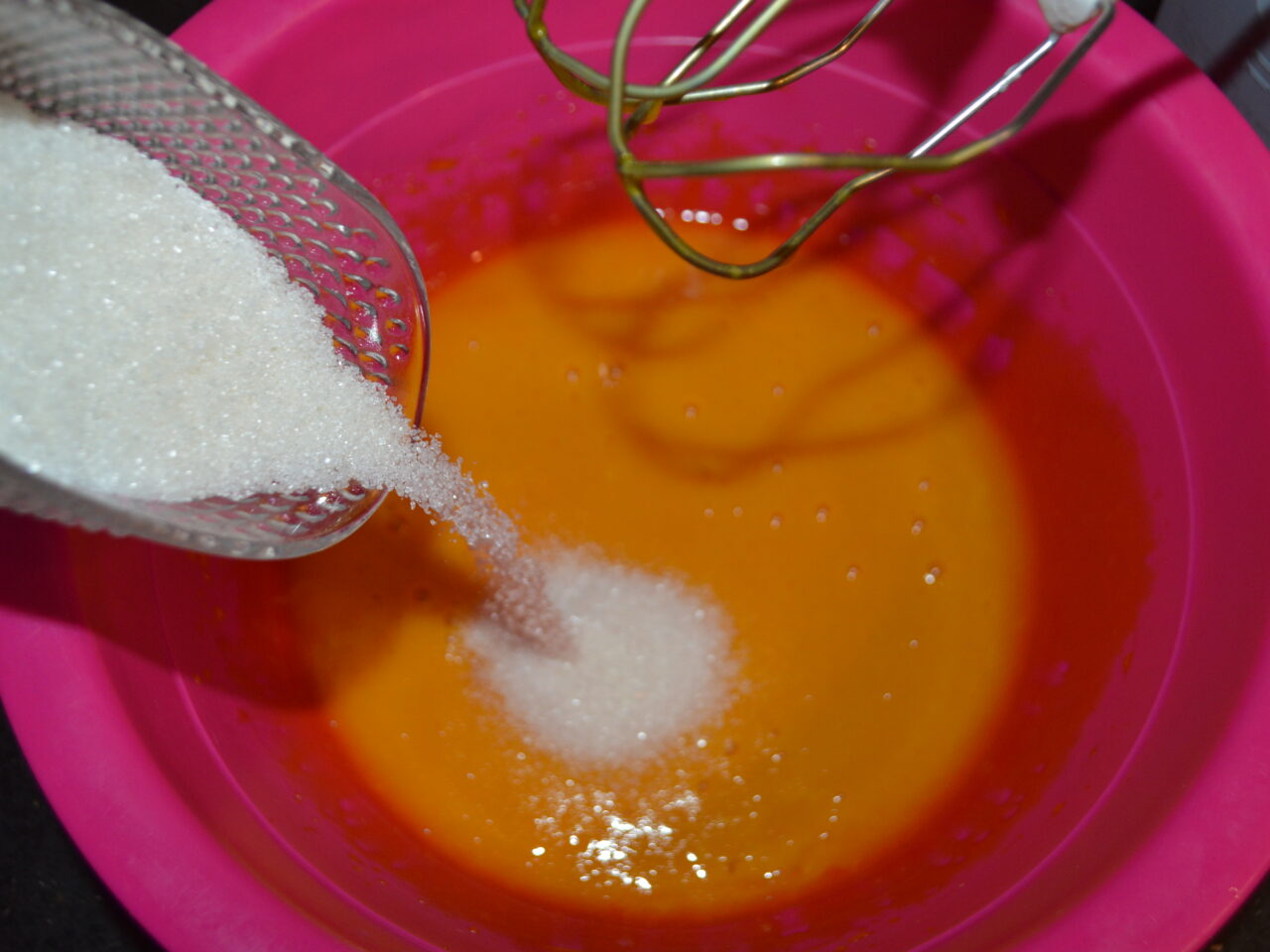 - Bateti cu mixerul galbenusurile si adaugati restul de 60 de gr de zahar.