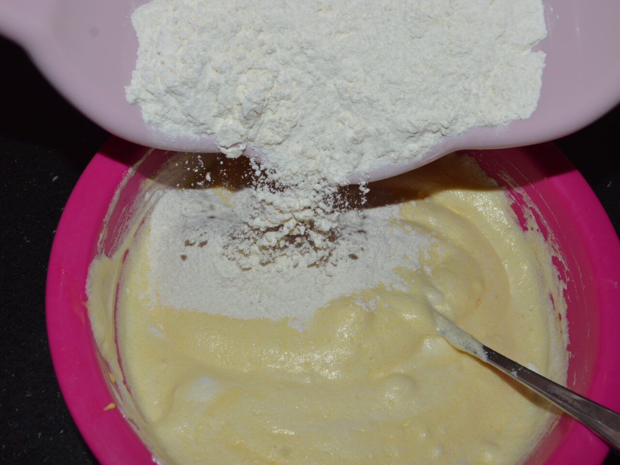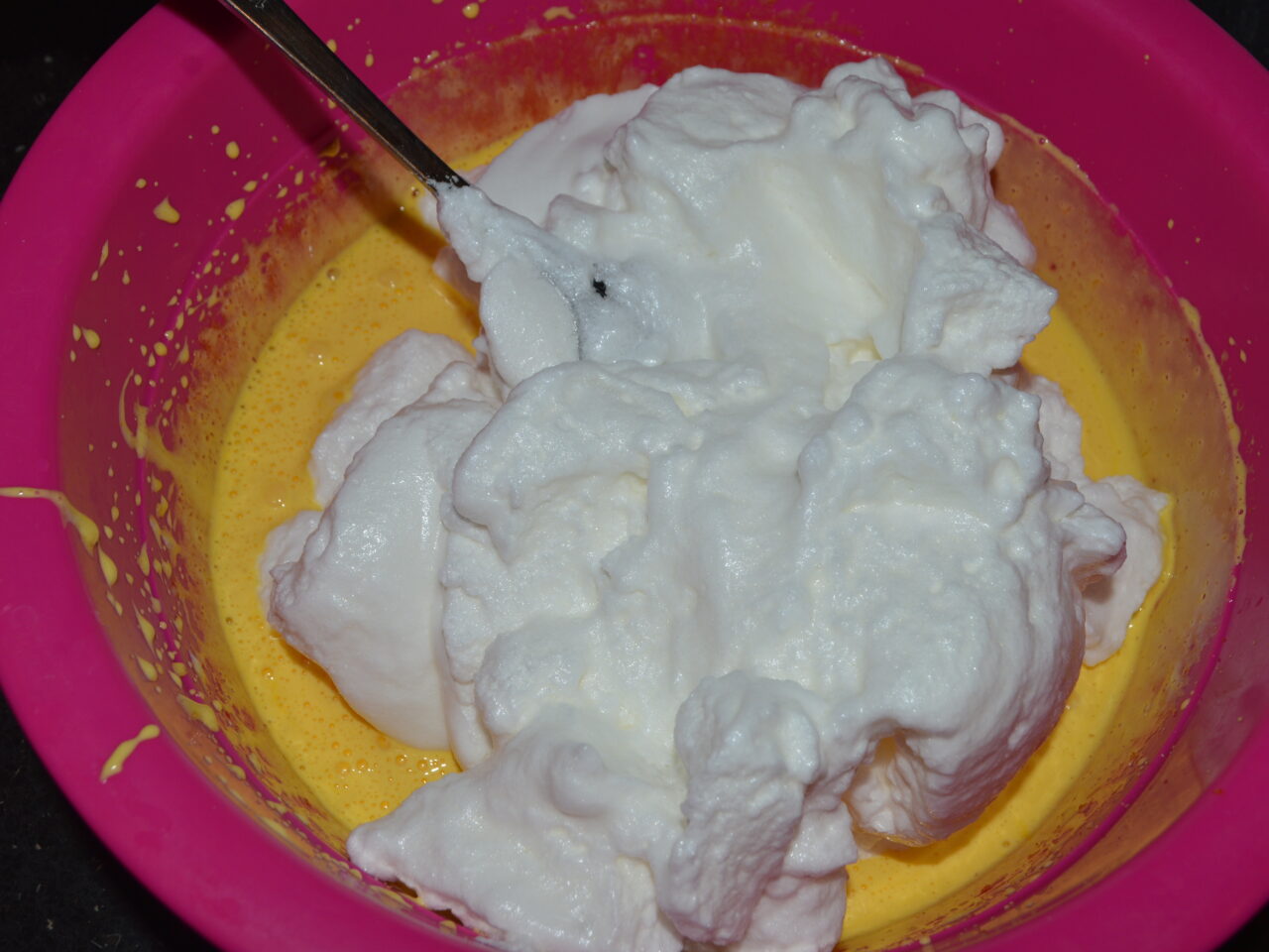 - Adaugati spuma de albusuri la compozitia de galbenusuri, si amestecati usor cu o lingura sau spatula.