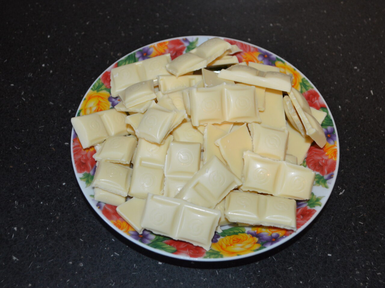 - Intre timp pregatiti crema. Rupeti ciocalata alba in bucati mici.