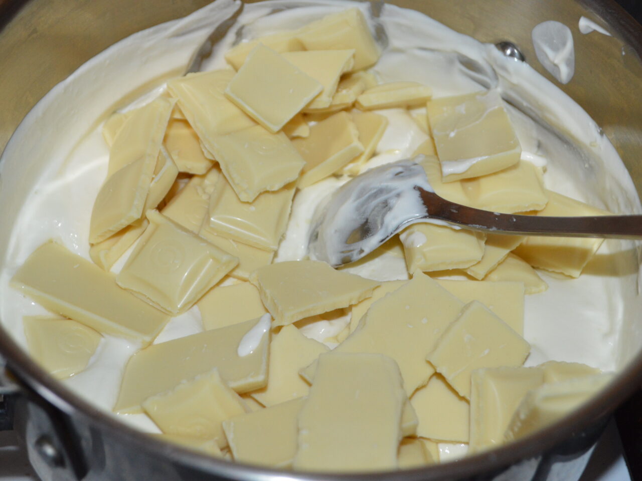 - Adaugati ciocolata alba in smantana fierbinte, si lasati-o 2 minute.