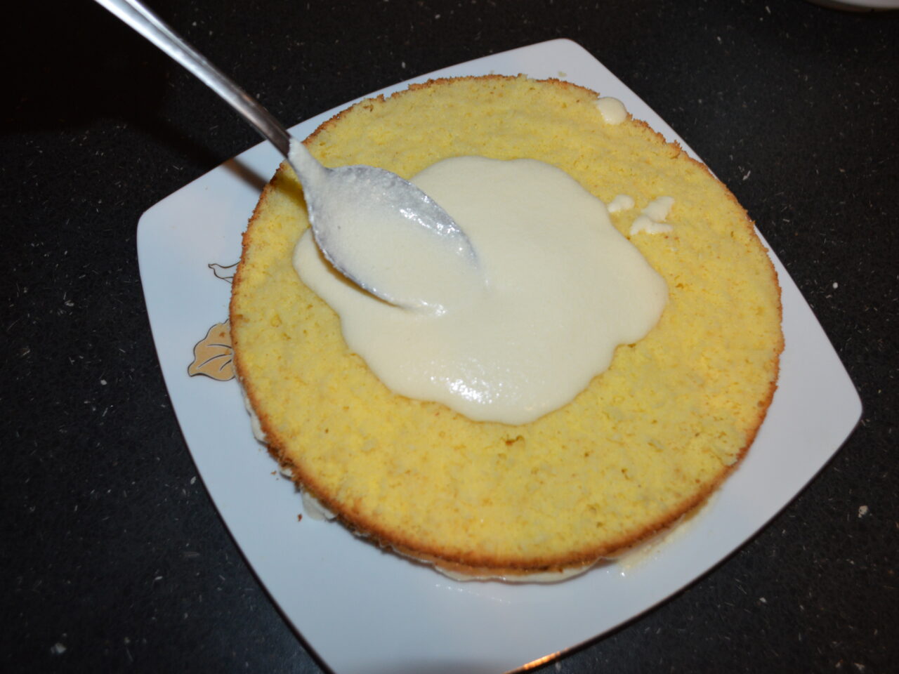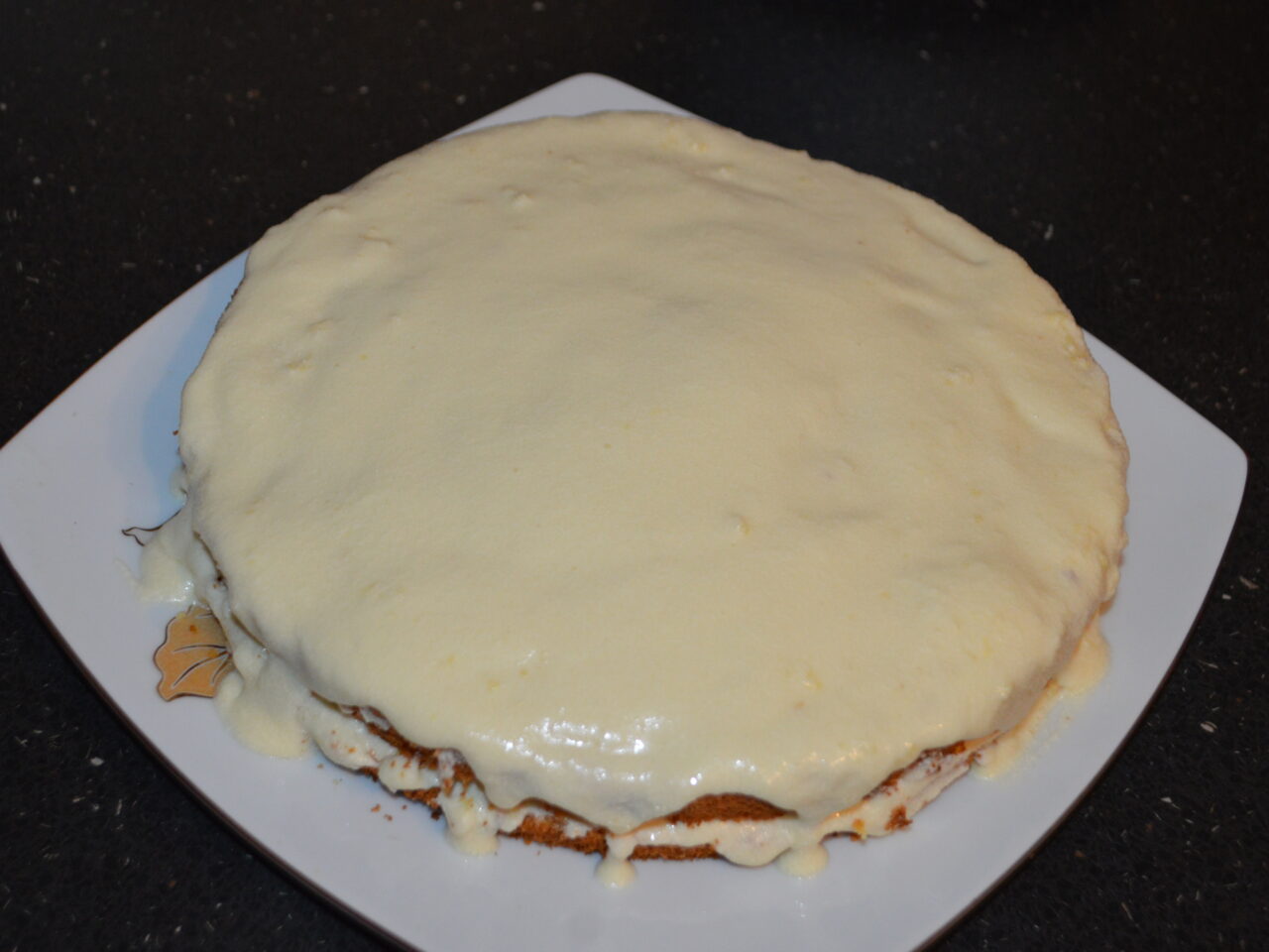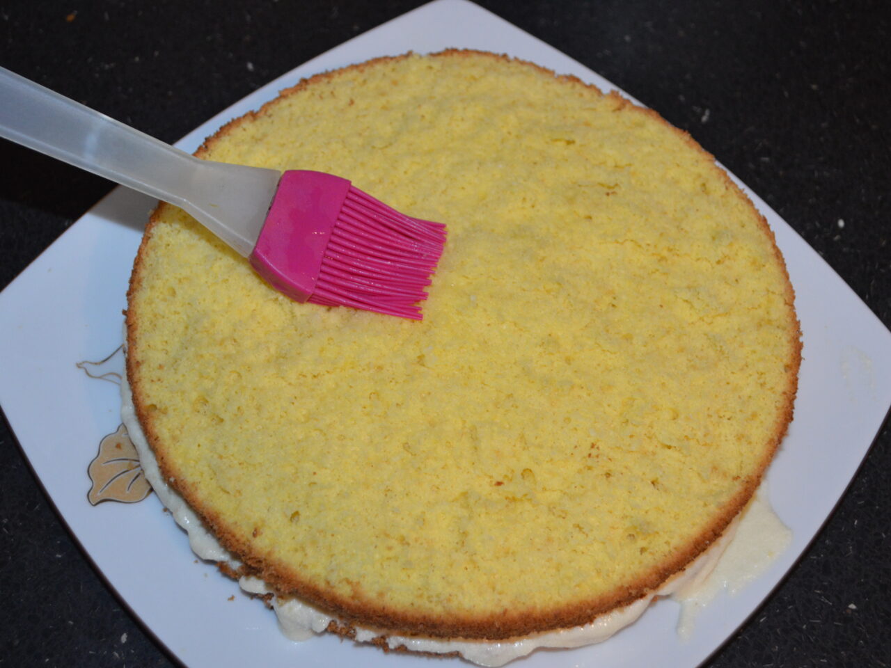 - Ansamblarea tortului: insiropati blaturile (sirop din 200 ml apa si 1 lingurita de zahar).