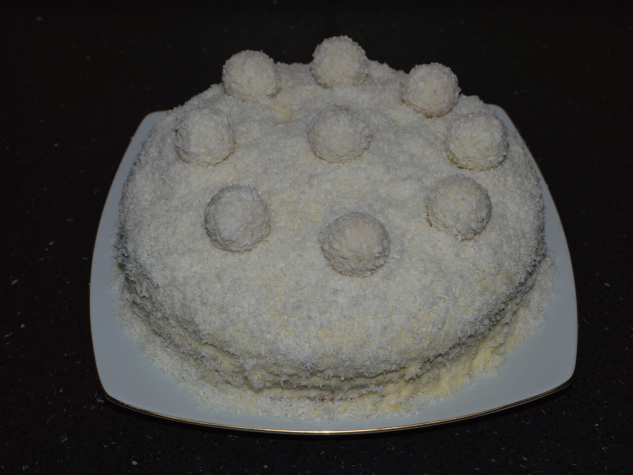 Reteta de tort „Raffaello” cu crema de smantana si ciocolata alba, ornat cu bomboane Raffaello si nuca de cocos. Un deliciu adevarat, cu un aspect elegant. Tortul Raffaelo este desertul care aduce pe masa rafinamentul si prospetimea inconfundabila a nucii de cocos. Blaturile moi si aerate se combina cu o crema fina, pe baza de lapte si frisca, imbogatita cu fulgi de cocos si migdale. Gustul sau delicat este atat de apropiat de bomboanele Raffaelo, incat fiecare felie devine o adevarata placere. Este desertul perfect pentru zile de sarbatoare sau ocazii speciale in familie.