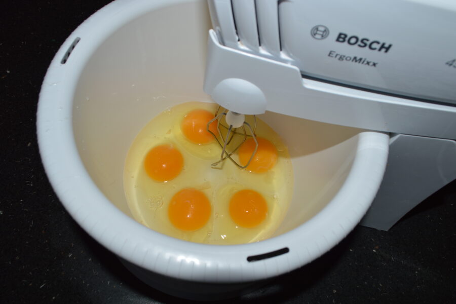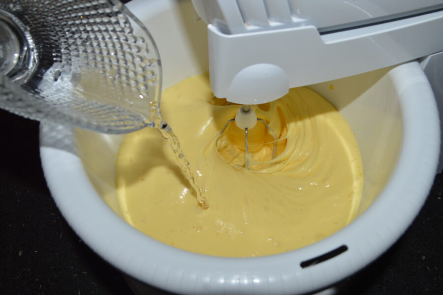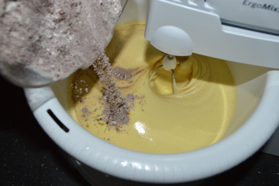 - Turnati treptat amestecul in castron, si mai mixati putin la viteza mica, pana se omogenizeaza compozitia.