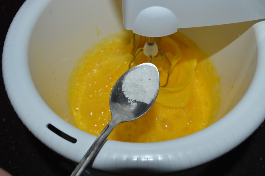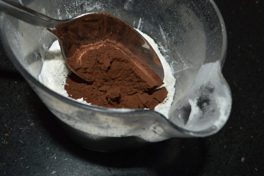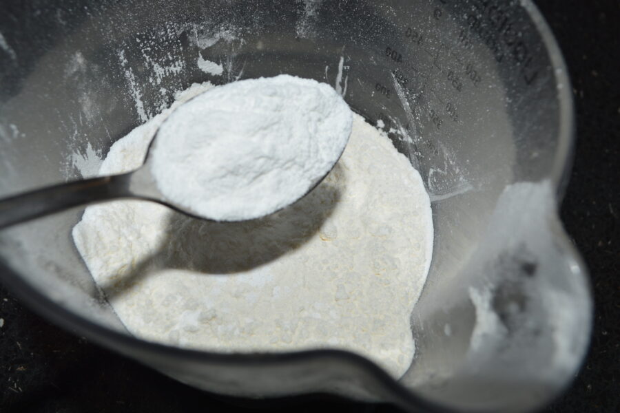 - Intr-un recipient aparte, masurati 110 grame de faina si adaugati o lingurita de praf de copt.